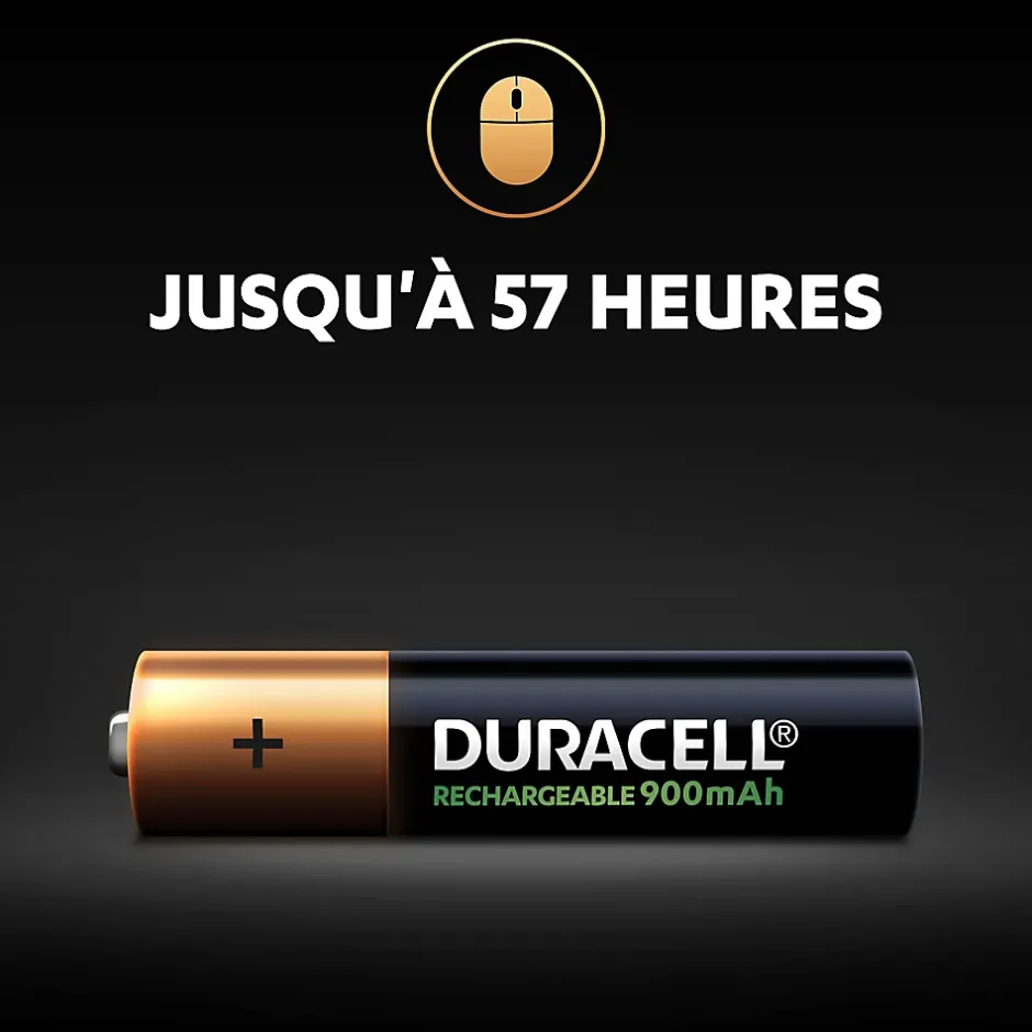 - Les piles rechargeables Duracell AAA 900mAh sont pré-chargées, prêtes à l’emploi.