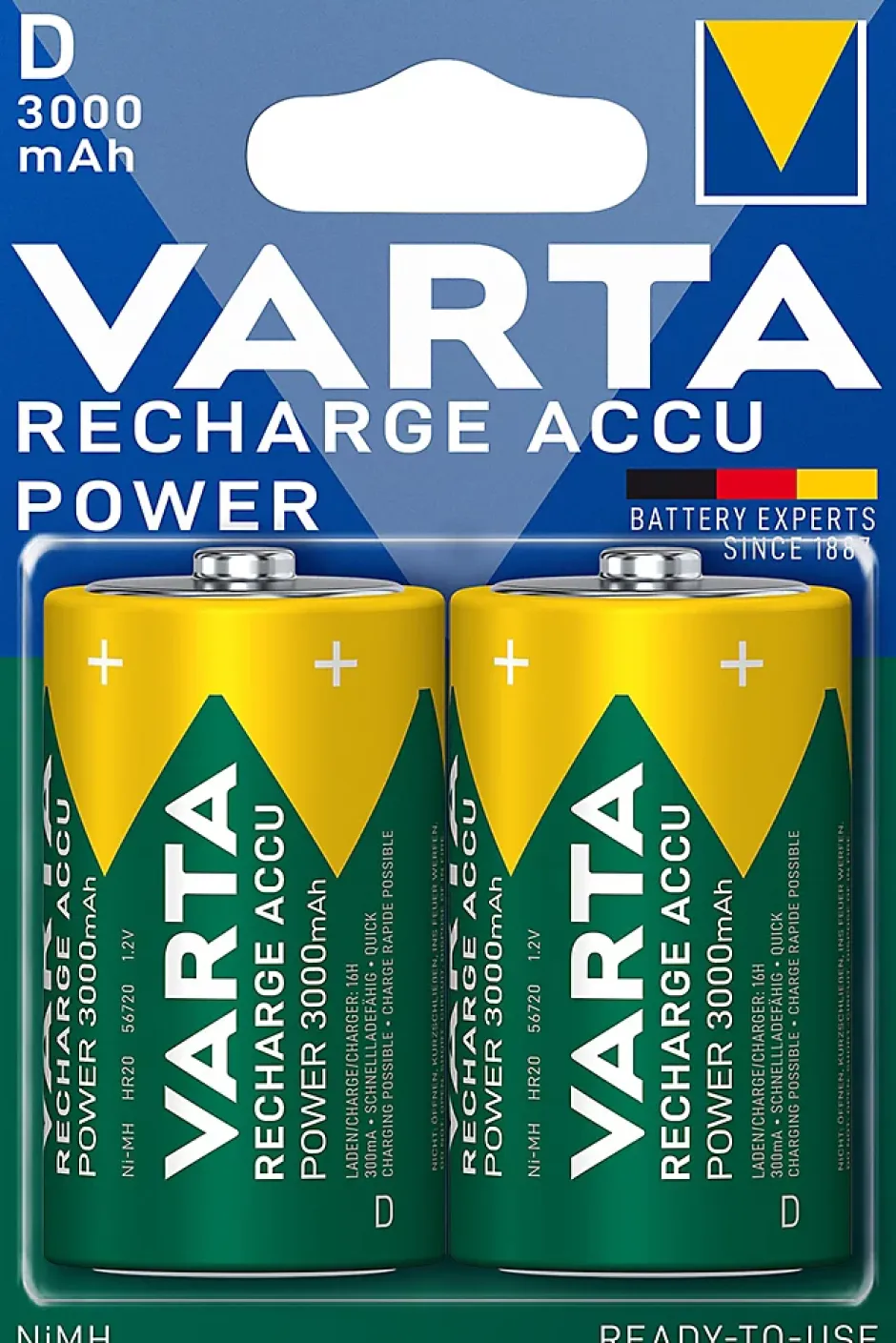 Les piles rechargeables Varta Ni-MH sont déjà chargées pour une utilisation immédiate. Ces piles sont à très faible décharge, ce qui leur confère une longue durée de conservation et supprime l’effet mémoire. Par conséquent, elles ne perdent pas leur pleine capacité, contrairement à d’autres types de pile. Conviennent à tous les chargeurs et appareils standard