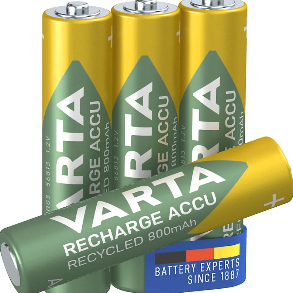 Accus VARTA Accu Recycle AAA 800 mAh (Ni‑MH, 1,2 V) préchargés Ready to Use pour une utilisation immédiate, faible autodécharge (70% après 12 mois) et 11% de matériaux recyclés, vendus en blister de 4.