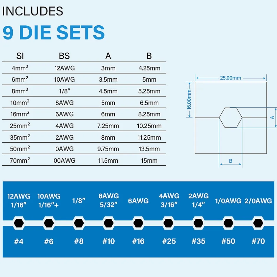 Description du produit:Caractéristiques:Matériau: acier 45 # yuansLongueur du produit : 31 cmPoids du produit : près de 4 lbCourse: 12mmForce de sertissage : 80kN (max 10T)Plage de sertissage : 4-70 mm², adapté aux tailles de fil 4/6/8/10/16/25/35/50/70 mm²Type de sertissage : sertissage hexagonalDimensions de la boîte de rangement : 33×7,7×15 cm (longueur x largeur x hauteur)Taille de l’emballage du produit: 35 cmLargeur de la taille de l’emballage du produit: 8 cmHauteur de la taille de l’emballage du produit: 16 cmPoids du colis du produit : 2,8 kgEmballage inclus:1 x boîte de rangement9 x adaptateurs à sertir (4, 6, 8, 10, 16, 25, 35, 50, 70 mm²)