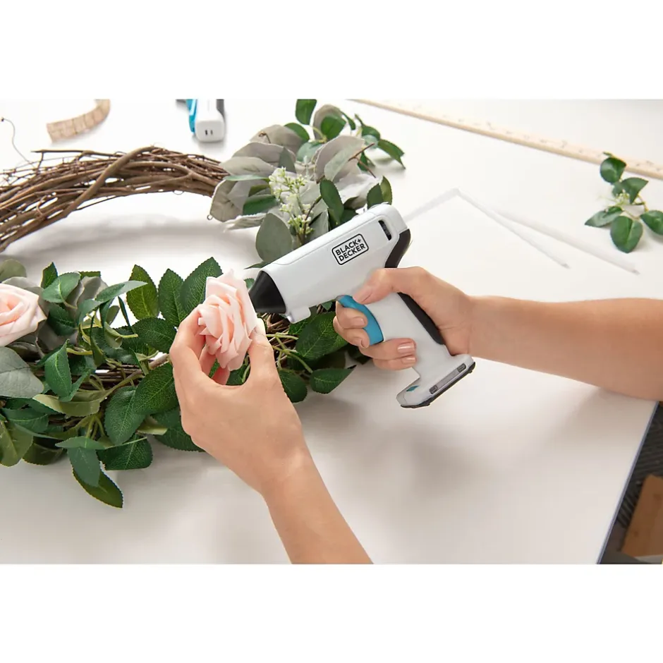 Pistolet à colle sans fil BLACK+DECKER BCGL115-XJ 3,6 V : chauffe en 30 s, batterie lithium 1,5 Ah (autonomie ~25 min), recharge USB‑C (~2,5 h), LED intégrée, arrêt de sécurité automatique et 20 sticks 7×100 mm inclus.