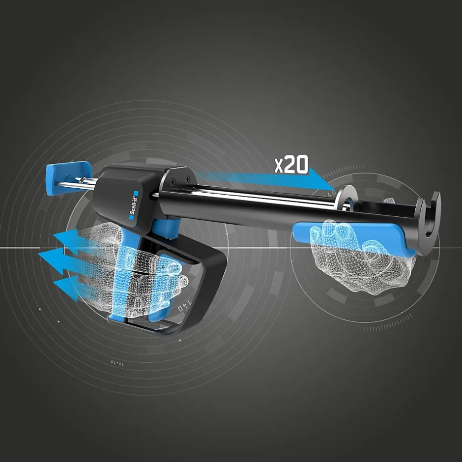 - FORCE D’EXTRUSION DÉMULTIPLIÉE PAR 20. Le système de transmission démultipliée permet à l’utilisateur de limiter ses efforts. Ainsi, 10 kg de pression appliqués sur la poignée permettent de générer 200 kg de force.
