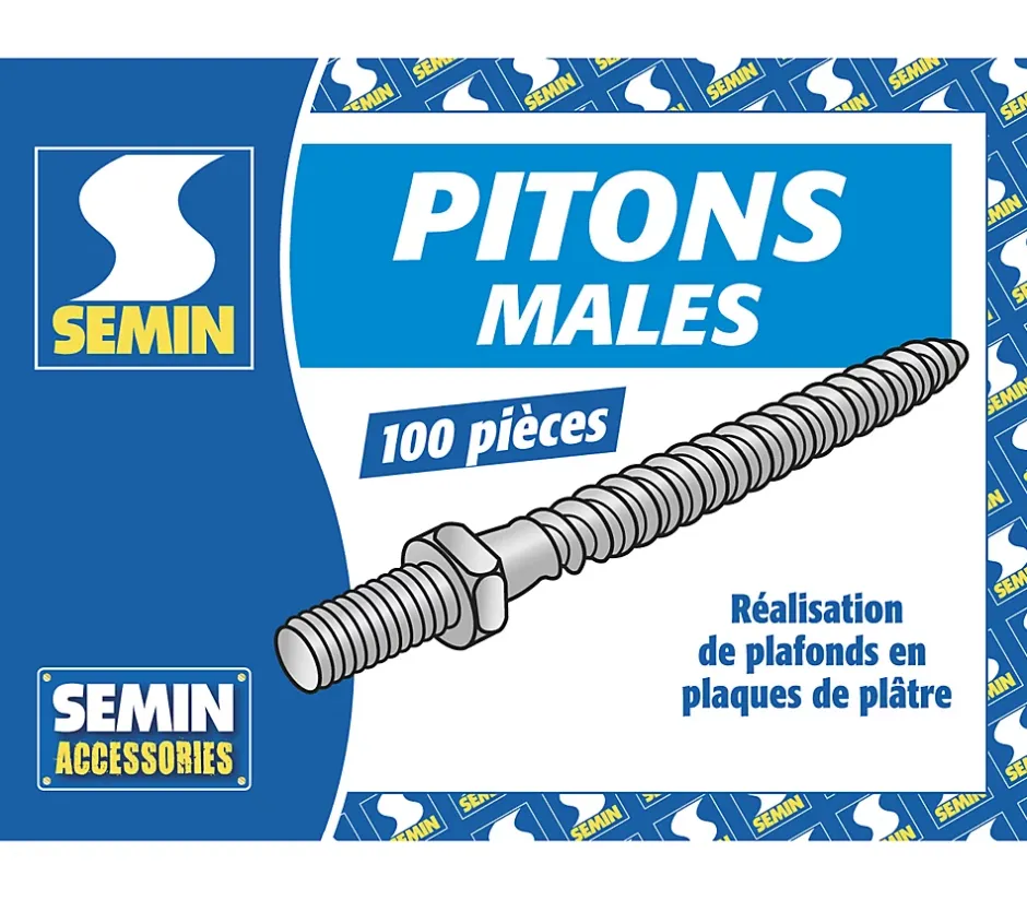 Le piton mâle permet la fixation d’un cavalier pivot en faux plafond.Il est utilisé pour la rénovation de plafond.Ce pack contient :- 2 boites de pitons mâles (200)CARACTÉRISTIQUES TECHNIQUESHauteur : 10 mmLongueur : 77 mmLargeur : 10 mmPoids : 0,013 kgCOMPOSITIONAcier zingué.