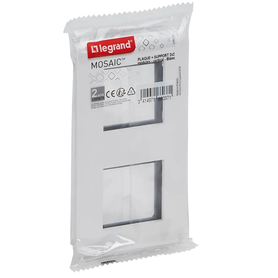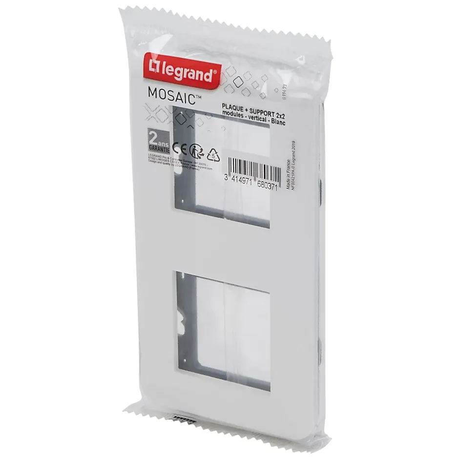 Plaque de finition + support Legrand Mosaïc 2 postes blanc, vertical