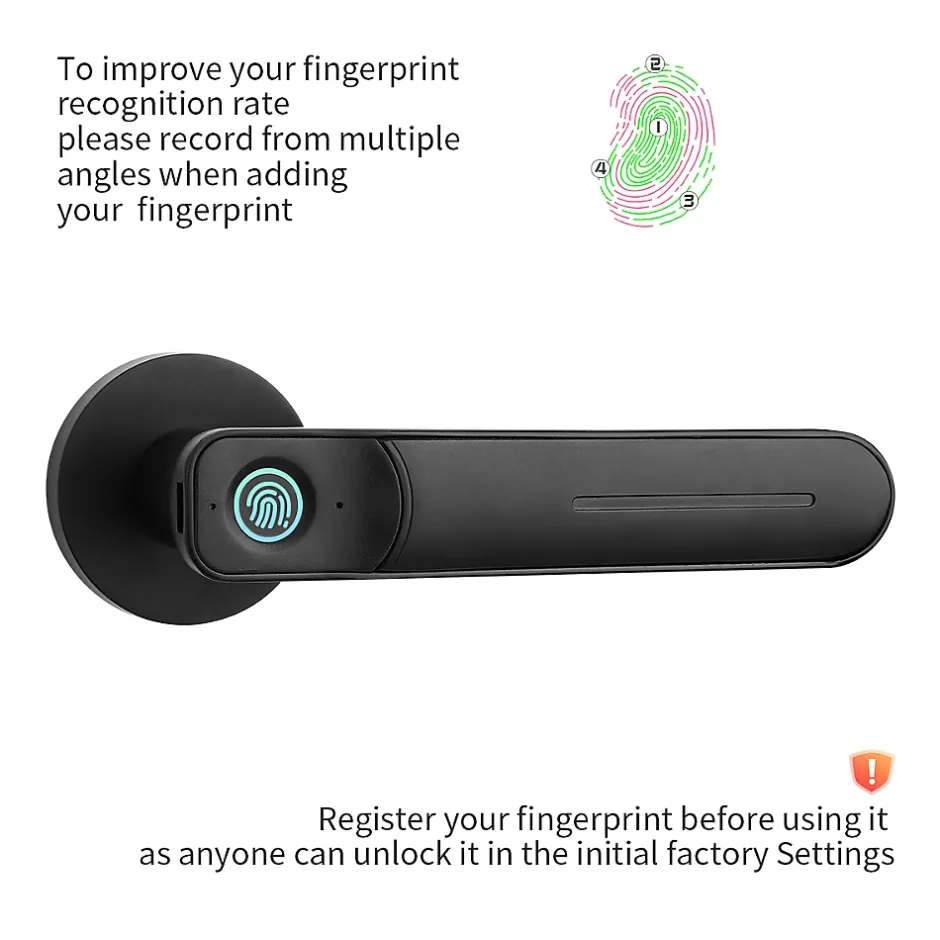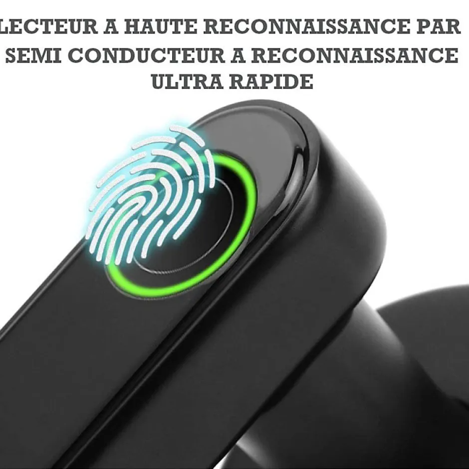Sécurisé rapidement votre serrure de porte grâce à cette poignée de porte à codes et empreintes.Vous pourrez rapidement installer cette serrure en lieu et place de votre poignée de porte et sécurisé la porte concernée.Cette serrure fonctionne via l’application TUYA qui permet de fonctionner avec de nombreux autres produits connectés.Vous pourrez ainsi:- Ouvrir votre porte via le bluetooth de votre téléphone- Créer un mot de passe temporaire valable une fois, ou valable sur une période donnée qui vous permettra de donnée accès à un visiteur unique ou à un visiteur présent sur une période donnée. Cette fonction et notamment très pratique pour les gites de vacances et locations de vacances. Le codes prendra fin selon votre choix. – Désactivé la fonction code sur une période donnée.Tous ces réglages sont disponibles via l’application.L’application permet d’attribuer des utilisateurs maitres qui reçoivent des notifications des qu’un utilisateur ouvre la porte.Vous recherchez une serrure de porte connectée à codes qui puisse être ouverte depuis votre Smartphone ?Vous pouvez soit remplacer votre poignée de porte par cette poignée à codes sur votre serrure actuelle. Soit installer la serrure fournie avec cette poignée de porte.La serrure est livrée également avec 2 clé d’ouverture manuel.4 manières d’ouvrir: Bluetooth Tuya Application Déverrouillage par Empreinte Digitale, Code PIN Déverrouillage, Clé Mécanique Déverrouiller. Si installation en plus non fourni d’une paserelle wifi tuya possible d’ouvrir à distance par téléphone.Longue cycles De Batterie Travailler avec6V, 4X piles AA (non incluses) / USB de charge d’urgenceMatérielEn alliage de zincCourant de fonctionnement240mAConsommation d’électricité statique30μAÉcran tactileEnregistrements de mot de passe10 groupes (1 groupe de mots de passe administrateur et 9 groupes de mots de passe des utilisateurs)Mémoire: 150 empreintes et 120 codes
