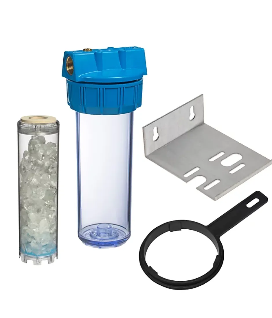 Porte-filtre à eau 9 ‘’ ¾ – 20/27F trois pièces complet avec cartouche anti-calcaire, équerre et clé Système de filtration pour traiter l’eau calcaire : sécurité et praticité L’ensemble du kit est composé d’un corps de filtre trois pièces : bague de serrage tournante pour une étanchéité optimale entre la cuve transparente et la tête bleue. Grâce à la cartouche fournie , luttez efficacement contre le calcaire chez vous. Vendu complet avec équerre et clé, ce système de filtration est la solution clé en main qu’il vous faut pour traiter l’eau de votre maison. Ce système ne réduit pas la dureté de l’eau : il s’agit d’une solution préventive anti-calcaire , idéale en complément ou en alternative à un adoucisseur. Solution clé en main pour traiter l’eau de votre maison. Installation rapide : montage et démontage aisée Cuve PET transparente : Vous permet un contrôle visuel sur l’état de votre cartouche pour savoir quand la changer Connexions standard (9 ‘’ ¾) Fabrication française , certifié ACS Fourni avec une cartouche anti-calcaire . Les cristaux de polyphosphate empêchent la formation de tartre sans dénaturer l’équilibre carbonique de l’eau. Cartouche remplaçable Etanche et robuste Les cristaux de polyphosphate forment un film de protection dans les canalisations et surfaces internes, ils empêchent le calcaire de se fixer et agissent en prévention, protégeant ainsi vos appareils sanitaires et robinets. Pour quelles utilisations ? Protection d’un chauffe-eau / ballon Moins de pannes et d’entretien Meilleur rendement énergétique Réduction des traces de calcaire sur les équipements (chauffe-eau, chaudière, lave-linge, lave-vaisselle et installation sanitaire) Vendu complet avec : Une cartouche anti-calcaire 9 pouces ¾ (taille standard) Equerre de fixation et vis Clé de desserrage Il est conseillé de changer la cartouche filtrante tous les 6 mois en moyenne.
