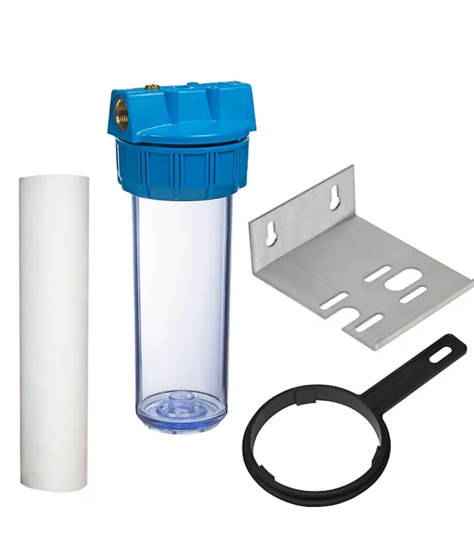 Porte-filtre à eau 9 ‘’ ¾ – 20/27F trois pièces complet avec cartouche anti-sédiment 20 microns, équerre et clé Élimine efficacement les impuretés présentes dans l’eau et protège durablement vos installations. – Système de filtration pour traiter l’eau chez vous : sécurité et praticité – L’ensemble du kit est composé d’un corps de filtre trois pièces : bague de serrage tournante pour une étanchéité optimale entre la cuve transparente et la tête bleue. – Grâce à la cartouche fournie , luttez efficacement contre les particules présentes dans votre eau. – Vendu complet avec équerre et clé, ce système de filtration est la solution clé en main qu’il vous faut pour traiter l’eau de votre maiso n. Solution clé en main pour traiter l’eau de votre maison Installation rapide : montage et démontage aisée Cuve PET transparente : Vous permet un contrôle visuel sur l’état de votre cartouche pour savoir quand la changer Connexions standard (9 ‘’ ¾) Fabrication française , certifié ACS Fourni avec une cartouche anti-sédiment . Elle est efficace contre les particules présentes dans votre eau d’une taille supérieure à 20 microns. Cartouche remplaçable Etanche et robuste Préfiltration efficace de votre eau Installation sous votre évier Installation en amont de votre adoucisseur d’eau Peut-être combiné à d’autres portes-filtres pour une action de filtration complète. Idéal en amont de l’installation, ce filtre protège efficacement vos équipements contre l’encrassement et l’usure prématurée. Protège : chauffe-eau, chaudière, robinetterie et électroménager. Vendu complet avec Une cartouche anti-sédiment ultra fine meltblown 20 microns 9 pouces ¾ (taille standard) Equerre de fixation et vis Clé de desserrage Il est conseillé de changer la cartouche filtrante tous les 6 mois en moyenne.