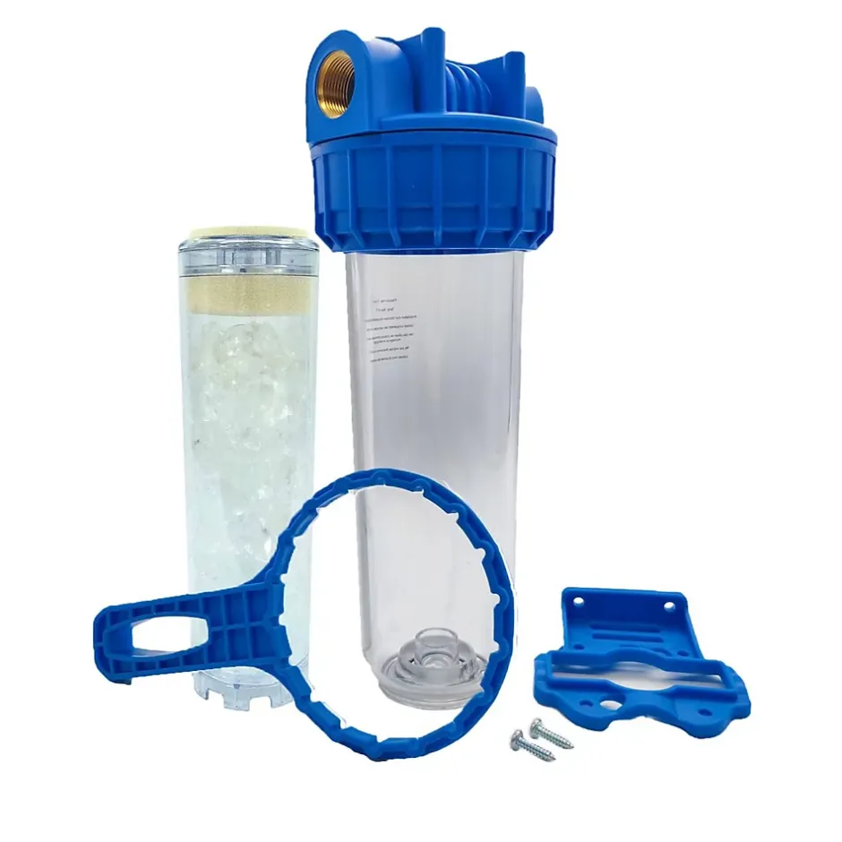 Système de filtration simple pour le traitement du calcaire sur le réseau d’eau L’ensemble est composé de 3 pièces avec une bague de serrage tournante qui assure une étanchéité optimale entre le bol transparent et la tête. Ce porte filtre 9″3/4 est idéal pour traiter les impuretés, sédiments, chlore, mauvais goût ou odeurs désagréables et même le calcaire présents dans l’eau. (Toutes les cartouches compatibles sont disponibles sur notre boutique.) Ce filtre monté complet permettra de prévenir le dépôt de calcaire dans vos canalisations ou sur vos appareils grâce à l’application d’une couche protectrice obtenue lors du passage de l’eau dans la cartouche et la dissolution des cristaux de polyphosphate.Contenu du kit de porte-filtre 9″3/4 + cartouche polyphosphate et insert laiton 20/271 Clé de montage / démontage.1 cartouche polyphosphate pour empêcher la formation de tartre.1 équerre de fixation.2 vis2 mamelons laiton Mâle/Mâle 20/27.