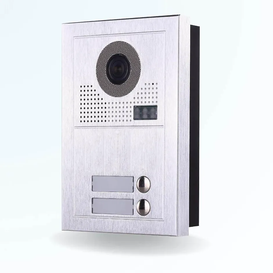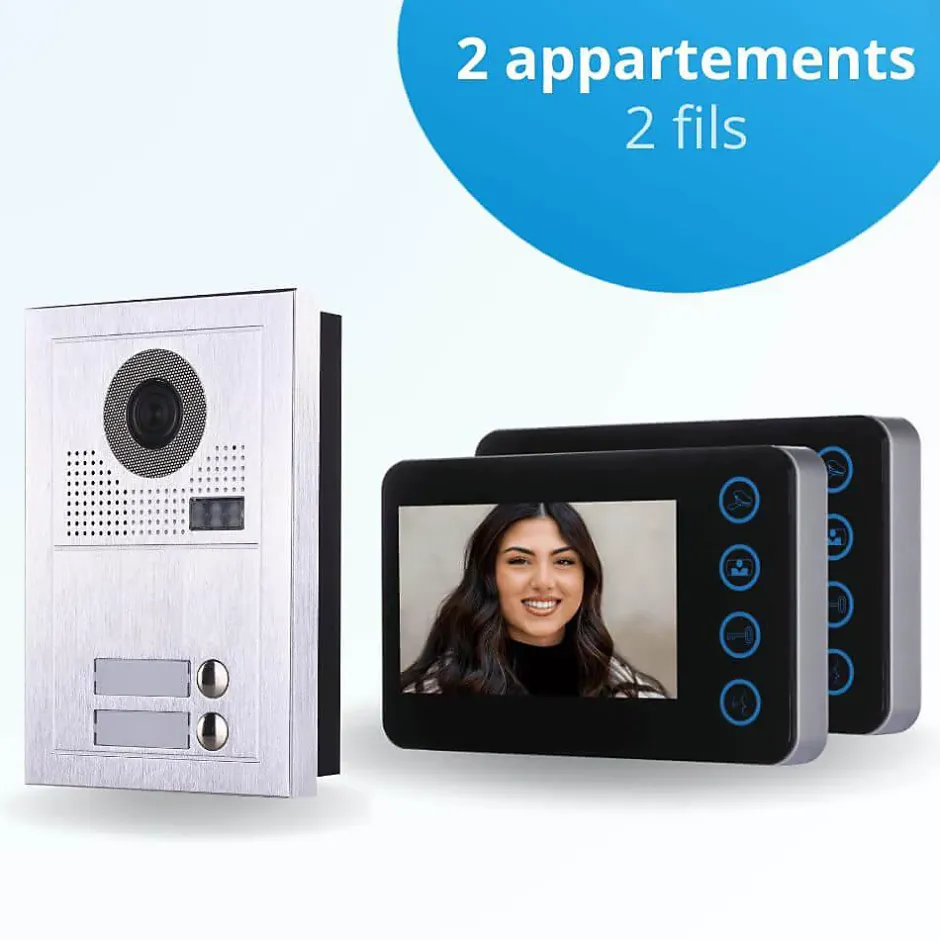 Kit visiophone collectif 2 fils permettant de gérer l’accès de 2 appartements grâce au portier 2 boutons et aux 2 stations intérieures couleurs.