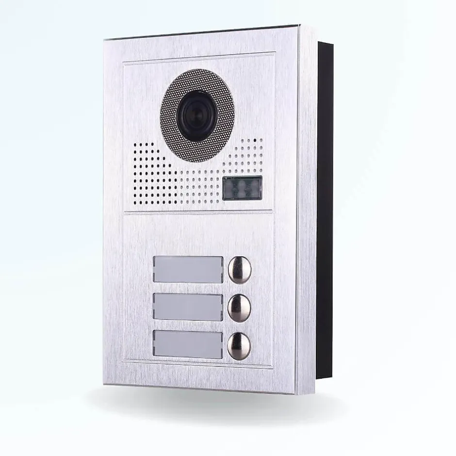 - Kit visiophone collectif 2 fils avec lecteur de badge permettant de gérer l’accès de 3 appartements grâce au portier 3 boutons et aux 3 stations intérieures couleurs.
