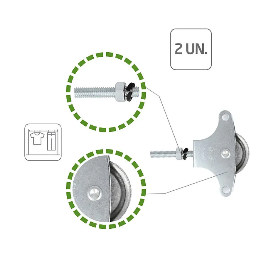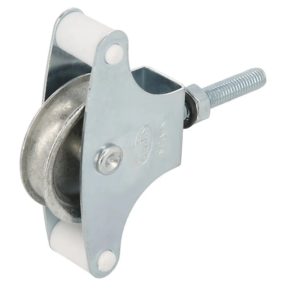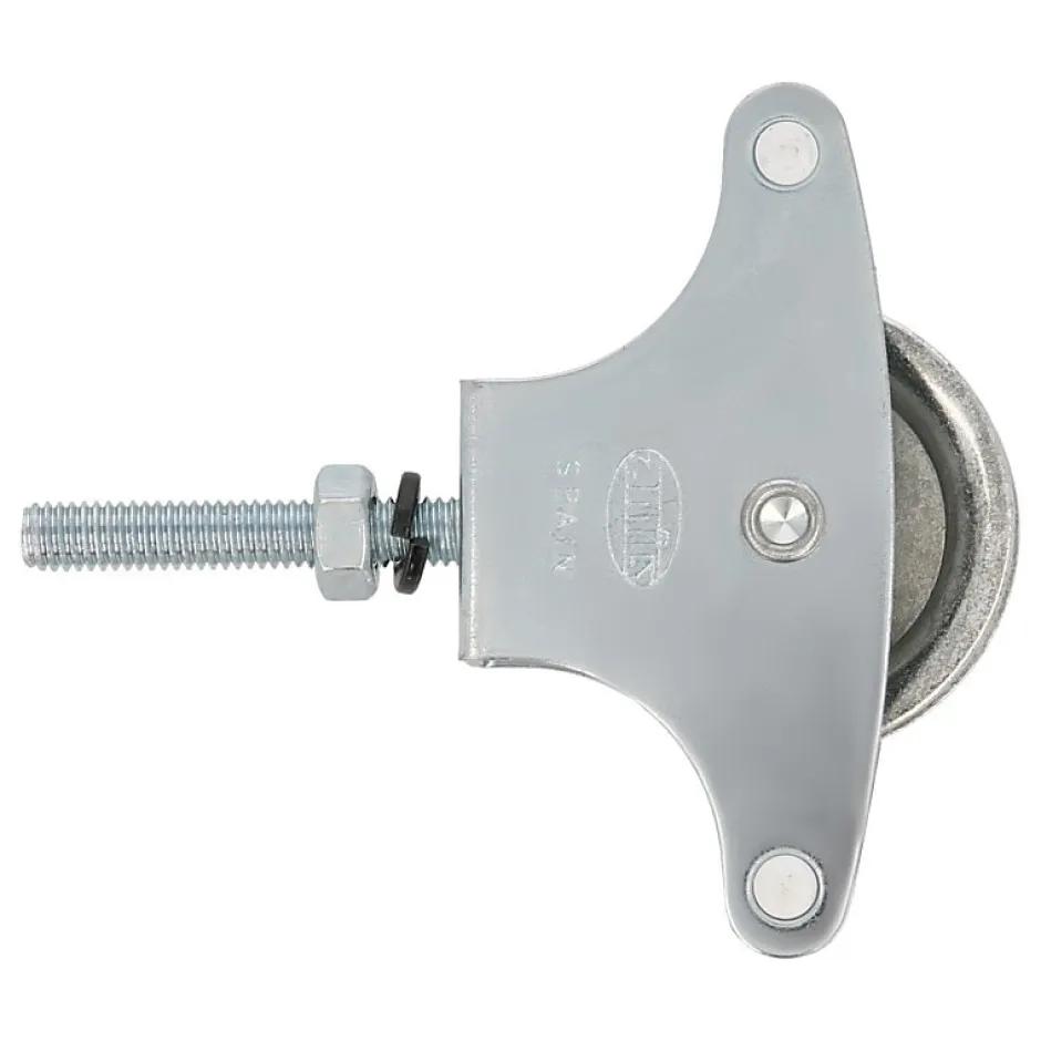 Poulie en acier avec roulette métallique de Ø 39 mm. Avec boulon de fixation et avec guides. Pour étendoirs. Poulie pour corde à linge avec corps en acier zingué. Poulie métallique Ø 39 mm avec canal de 8 mm. Guides de sécurité en plastique inclus. Fixation par vis M6 avec rondelle et écrou inclus.
