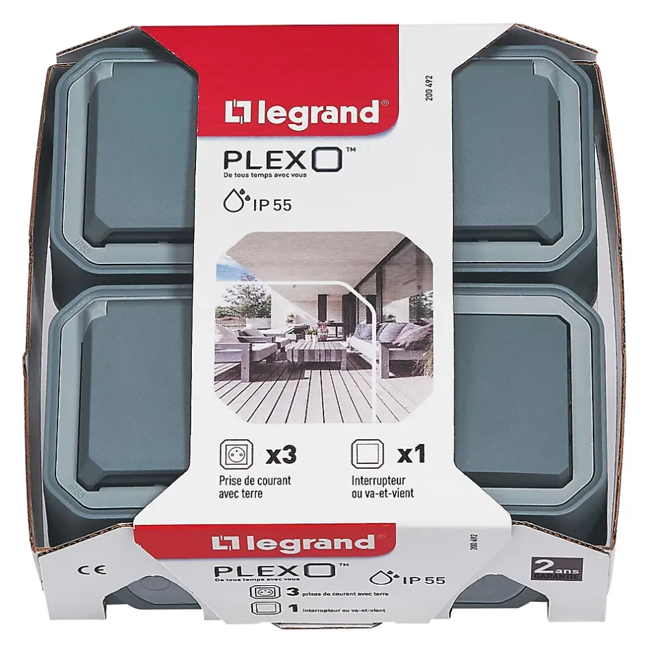 Lot de 3 prises 2 pôles+terre et 1 interrupteur Legrand Plexo gris