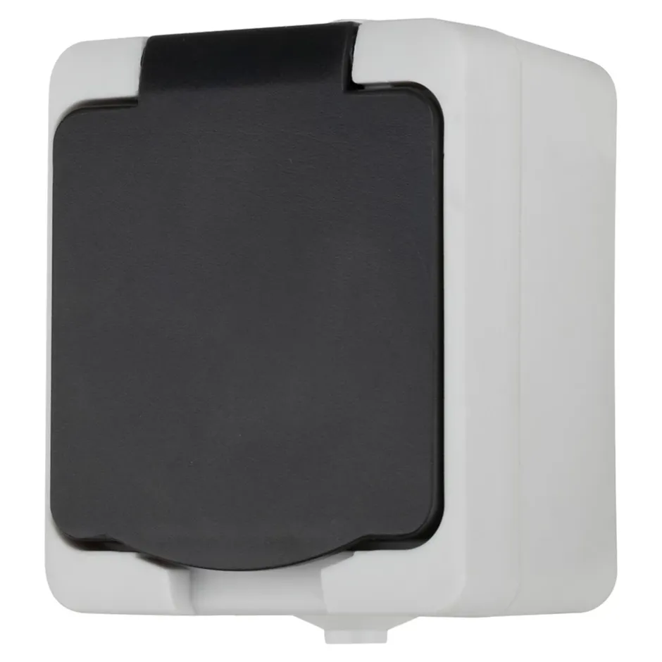 - Prise imperméable avec protection de sécurité, indice de protection IP55, robuste et résistante aux chocs, pour une alimentation électrique sûre en extérieur