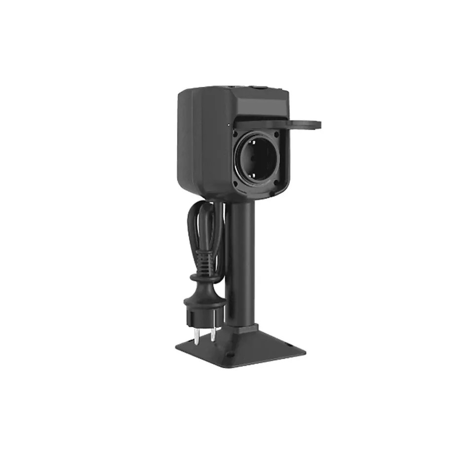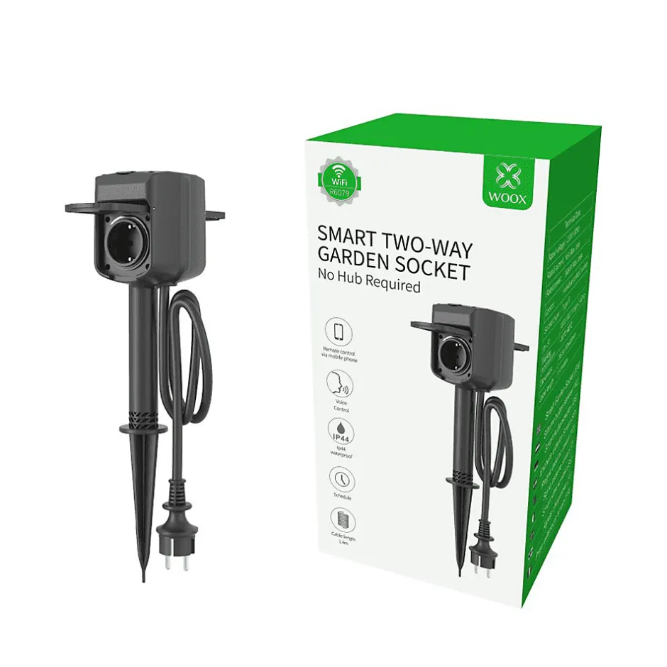 Prise extérieure bidirectionnelle intelligente – R6079 – WooxLa prise intelligente extérieure double WIFI noir R6079 de Woox est un produit pratique et facile à installer qui permet d’alimenter vos équipements extérieurs en toute simplicité. Grâce à ses deux prises de courant intelligentes 16A Type F, vous pouvez contrôler individuellement ou en groupe vos appareils via l’application gratuite WOOX Home ou par commande vocale via Amazon Alexa, Google Assistant et Siri.Le modèle R6079 de la marque Woox est livré avec un système de support multiple qui offre une grande flexibilité d’installation. Vous pouvez utiliser la tige fournie pour le fixer dans le sable, la boue ou l’herbe, ou utiliser un pied avec 4 trous de vis afin de le poser sur une surface plane. Vous pouvez également le visser sur un mur, une dalle de pierre ou une plate-forme en bois.L’électricité circule vers la prise intelligente extérieure double WIFI noir de Woox via son câble d’entrée AC de 140 cm de long de type H07RN-F 3G1.5 mm² avec une fiche de type F, que vous pouvez insérer dans n’importe quelle prise murale ou rallonge. De plus, les couvercles des prises sont munis de ressorts pour garantir une installation étanche.En outre, le set comprend la prise R6079, les supports multiples (Pin & Foot + vis) et le manuel d’utilisation multilingue.Caractéristiques principales :Protocole de communication : WIFI IEEE 802.11 b/g/n 2,4 GHzMax. Puissance de transmission : 19,93 dBmTension nominale : 230 V~50 HzCourant nominal : 16 A max. le totalPuissance nominale : 3680W max. le totalIndice d’étanchéité : IP44Contrôle : application WOOX HomeType de prise : Type F, SchuckoTempérature de fonctionnement: -10 ℃ ~ 40 ℃Dimensions : 85.5 x 102 x 420 mmPoids net : 350 grammesLongueur du câble / prise: 1 0,4 mètres / type F, SchuckoPortée Wi-Fi : 30 mètres en zone ouverteProtection de l’obturateur : Sécurité enfant : OuiVoyant d’alimentation : bleuMatériaux : Cuivre, PP, Caoutchouc, PVC