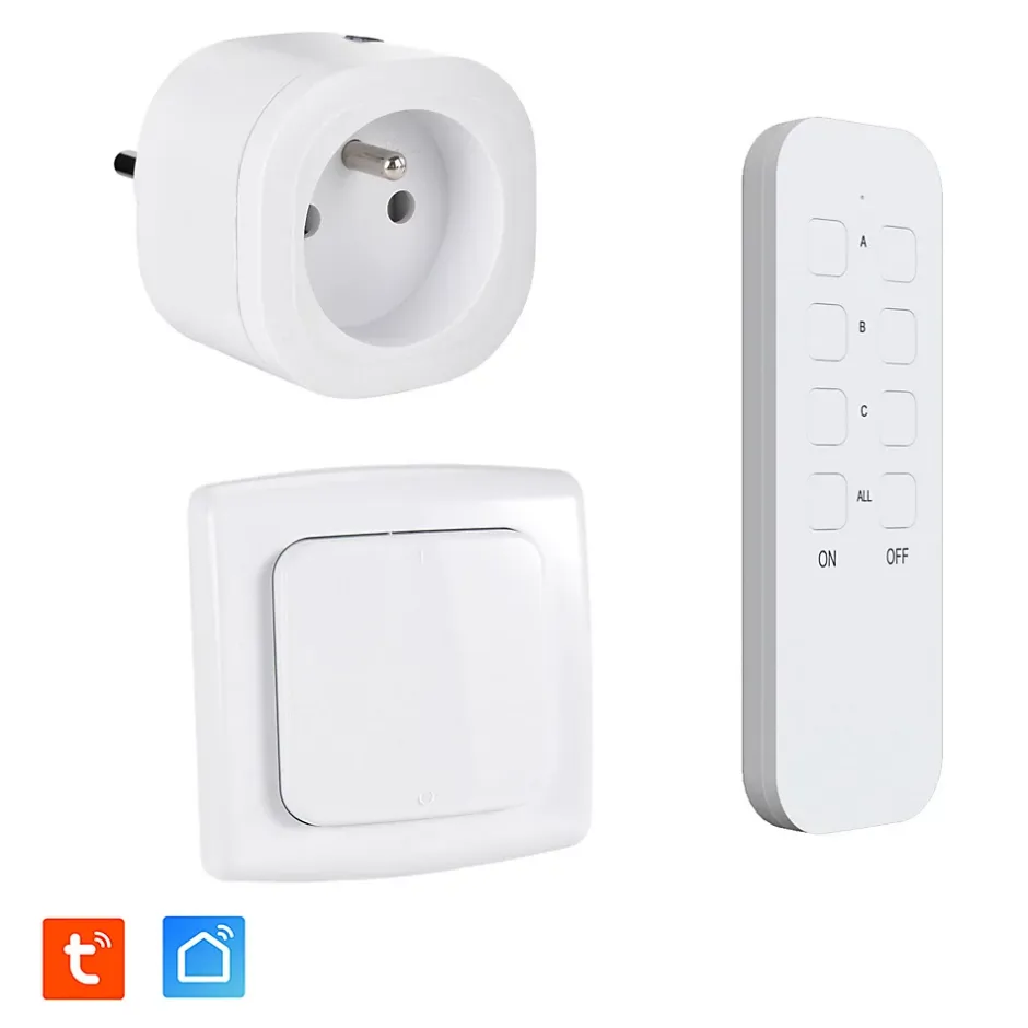 DescriptionPrise connectéeApplication compatible : TUYA Smart / Smart LifeConnexion : WiFi 2,4 GHz (IEEE 802.11 b/g/n) + RF 433,92 MHzPuissance max émission WiFi : 20 dBmPuissance maximale : 3680 W (230 V~ 50 Hz, 16 A)Type de prise : Type E (EU)Distance de fonctionnement (RF) : 30 m en champ libreIndice de protection : IP20Température de fonctionnement : 0 °C à 35 °CDimensions : 55 × 55 × 75,4 mmMatériau : Plastique ignifugé Interrupteur sans filFréquence : 433,92 MHzPuissance de transmission max. : 10 mWDistance de fonctionnement : 30 m en champ libreAlimentation : 1 pile bouton CR2032 (3V DC, incluse)Indice de protection : IP20Température de fonctionnement : 0 °C à 35 °CDimensions : 80 × 80 × 20 mmMatériau : Plastique TélécommandeFréquence : 433,92 MHzPuissance de transmission max. : 10 mWDistance de fonctionnement : 30 m en champ libreAlimentation : 1 pile bouton CR2032 (3V DC, incluse)Indice de protection : IP20Température de fonctionnement : 0 °C à 35 °CDimensions : 37 × 110 × 9 mmMatériau : Plastique Idéal pour✅ Commander vos lampes, chauffages d’appoint ou petits électroménagers✅ Automatiser vos appareils via TUYA / Smart Life✅ Un usage mixte : Combiner le pilotage smartphone (via TUYA / Smart Life) et télécommande et interrupteur physique✅ Les utilisateurs recherchant une solution pratique et flexible