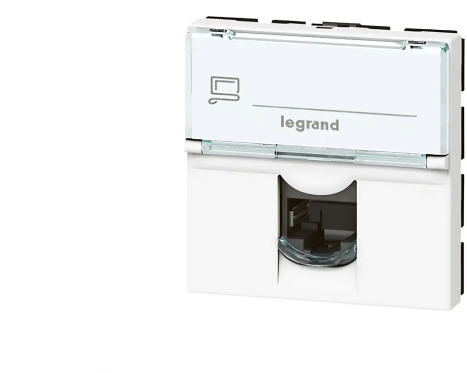 Prise RJ45 Legrand Mosaic Catégorie 6A STP en encastrable 2 modules (45 x 45 mm) finition blanche brillante RAL9003, connectique automatique sans outil compatible AWG22–26, blindage métallique (STP) et code couleur T568A/B, conçue pour réseaux haute vitesse jusqu’à 10 Gbit/s, IP20 et IK03, sans halogène. Fourni en mécanisme avec enjoliveur, nécessite support et plaque Mosaic.
