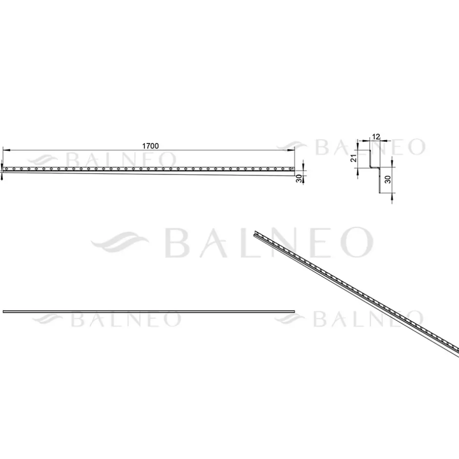 Caractéristiques techniques: Type : Montage mural Matériau : Acier inoxydable AISI 304 Disponible en 2 longueurs (120cm et 170cm) Disponible en 4 couleurs (noir, inox, cuivre, or) Disponible en 2 versions selon le côté d’installation (gauche/droite) Utilisation : parallèle au mur – pour couvrir les bords du carrelage Découpe sur mesure : possibleAvantages : Recouvrement esthétique des bords de carreaux lors de la création d’une douche à l’italienne. Conçu pour être installé contre le mur à recouvrir de carreaux (pas besoin de marteler le mur) Force une pente de 1,5 %, ce qui est la pente idéale pour un drainage efficace du savon Réduit le temps d’installation des carreaux sans avoir à les couper Fabriqué en acier inoxydable de haute qualité pour une durabilité à long terme. Facile à nettoyer : il suffit d’un chiffon en microfibre et d’un nettoyant pour vitres. La teinte est assortie aux autres produits Balneo pour la salle de bains.