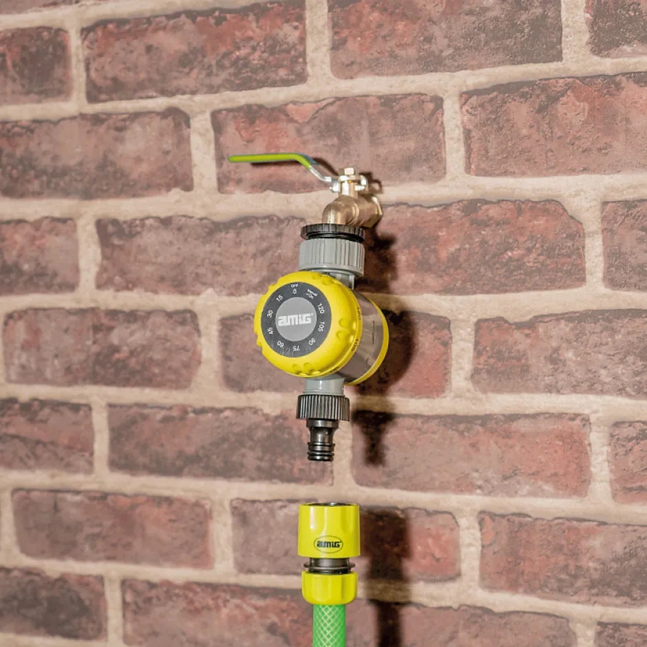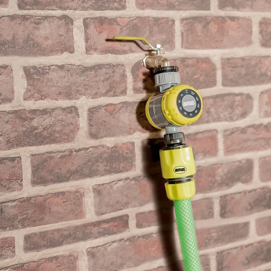 Programmateur d’arrosage manuel. Durée d’arrosage jusqu’à 2 heures. Avec filtre pour protéger le tuyau. Adaptateur de robinet réglable aux filetages de robinet de 19 mm.