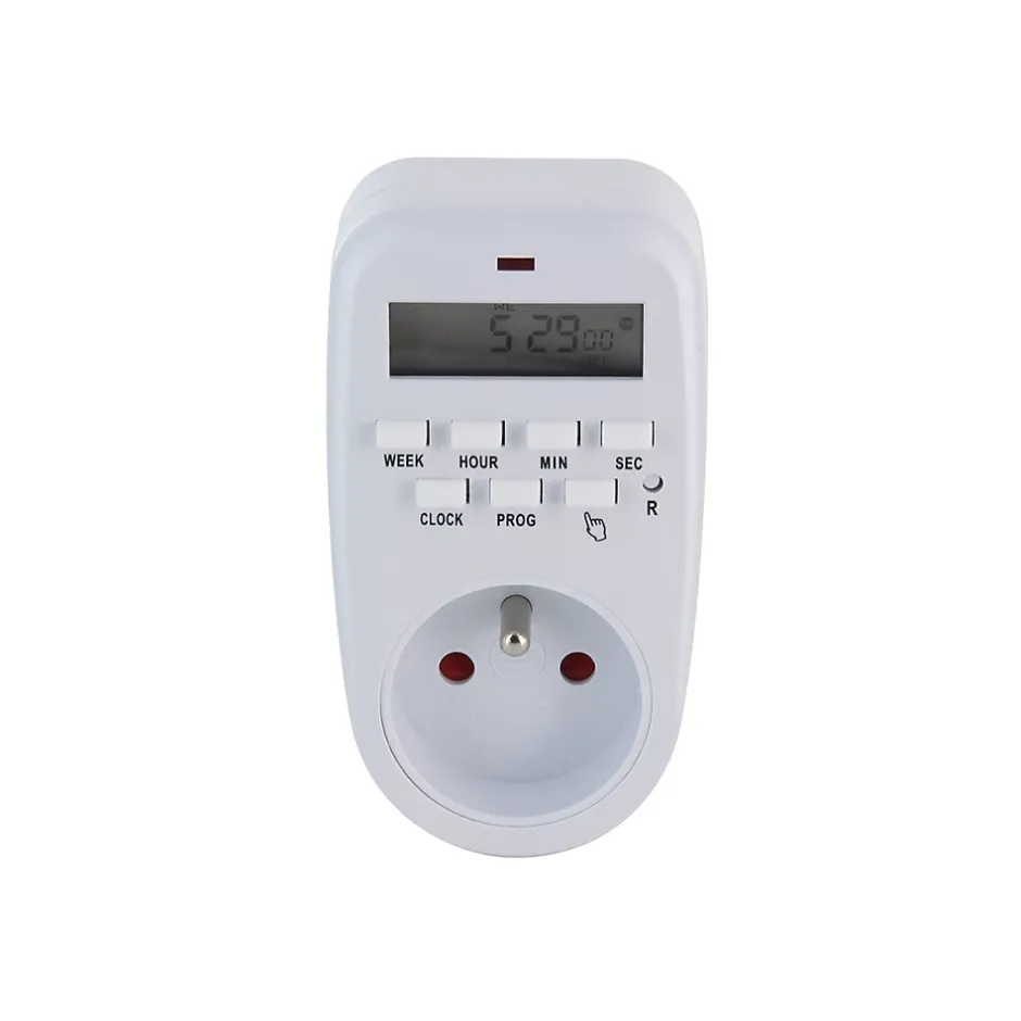 Programmateur digital . Couleur(s) : blanc. Type de prise : FR. Alimentation : secteur. Tension : 230 V. Puissance maximale : 3680 W. Nombre de programmes : 20 cycles marche/arrêt. Modes de programmation : jour, groupe de jours, week-end, tous les jours. Déclenchement aléatoire, compte à rebours. Interrupteur intégré. Batterie fournie : LR44 1,5 V