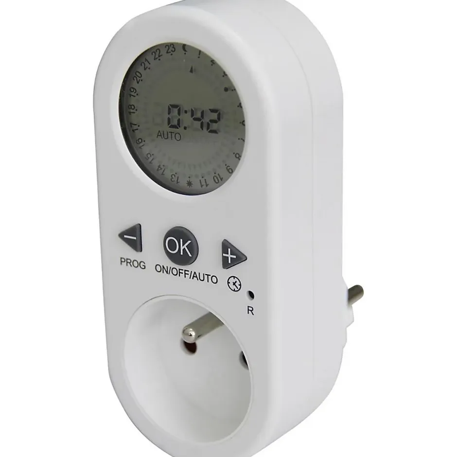 Programmateur digital. Couleur(s) : blanc. Type de prise : FR. Alimentation : secteur. Tension : 220–240 V CA. Puissance maximale : 1800 W. Indice de protection : IP20. Nombre de programmes : 42 cycles On/Off. Modes de programmation : jour, groupe de jours, week-end, tous les jours. Fonction sauvegarde et aléatoire. Les piles sont fournies. Grand LCD pour lecture facile
