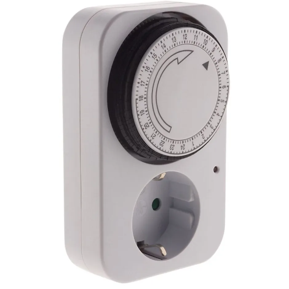 Programmateur mécanique quotidien. Couleur(s) : blanc. Inclus : sécurité enfants et interrupteur. Puissance max : 3680W. Tension : 230V (50Hz). Commutation toutes les 15 minutes