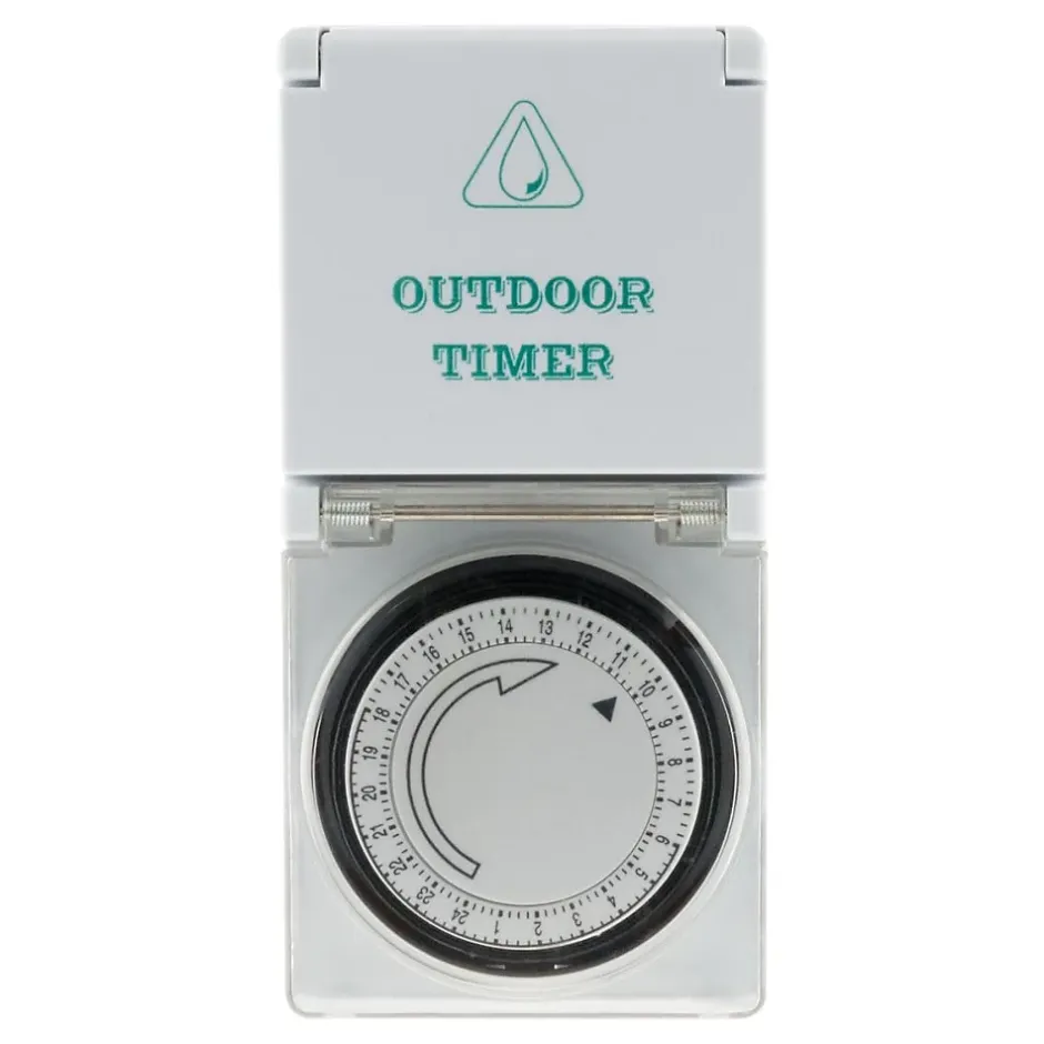 Programmateur mécanique étanche Schuko. Couleur(s) : blanc ou vert. Programmateur étanche. Indice de protection : IP44. Commutation toutes les 15 minutes. Recommandé pour les environnements humides ou en extérieur. Minuterie quotidienne. Sécurité enfants. Avec interrupteur