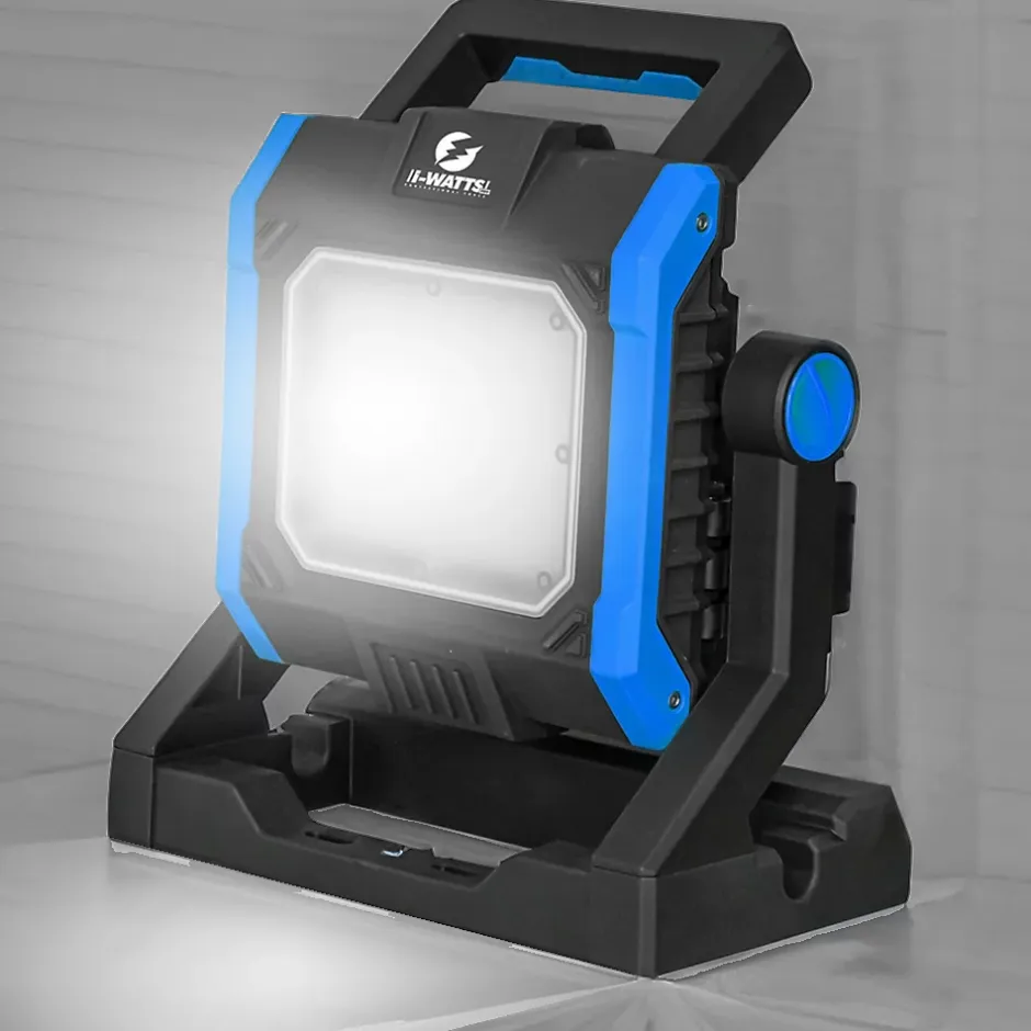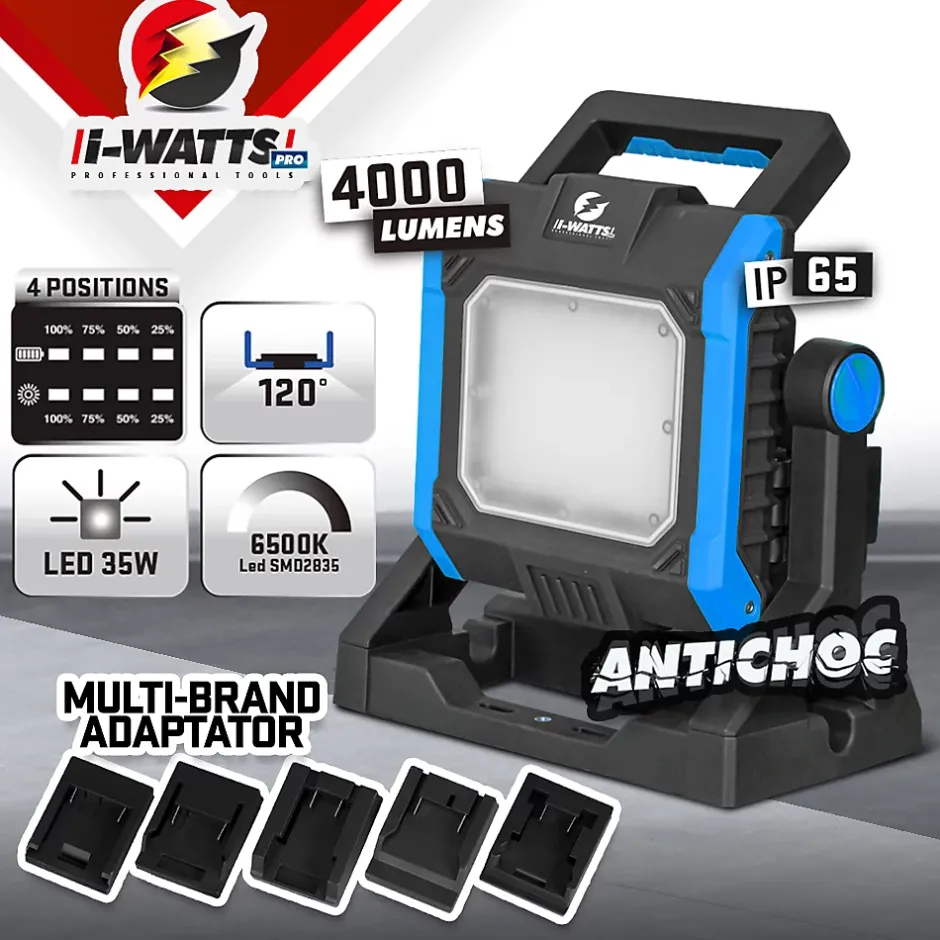 Ce projecteur de chantier multi batterie 35 W de la marque I-Watts Pro est compatible avec les batteries 18-20V de 8 fabricants : Bosch Professional, Metabo, Milwaukee, Dewalt, Makita, Stanley, Porter cable et Black and Decker.Vous avez déjà une batterie compatible dans votre assortiment d’outillage, vous choisissez le bon adaptateur et le tour est joué, vous pouvez utiliser votre nouveau projecteur sans avoir besoin d’investir dans une nouvelle batterie et un nouveau chargeur.Léger et facile à transporter, il possède une poignée de transport. La qualité de ses composants lui offre une longue durée de vie. Sa technologie LED consomme peu d’électricité et permet donc d’économiser de l’énergie. Ce projecteur de chantier permet une bonne diffusion de la lumière grâce à un angle d’éclairage de 120° et un flux lumineux de 4000 lumens. Il possède un indice de protection IP65, c’est-à-dire qu’il est protégé contre la poussière et les jets d’eau provenant de toutes les directions. Il dispose de 4 modes d’éclairage : 25 – 50 – 75 ou 100% et d’un témoin de chargeCaractéristiques :- Puissance: 35 W- Led SMD2835- Flux lumineux: 4000 lumens- Angle d’éclairage: 120°- Dimensions : L 25.5 x P 15 x H 32cm- Poids : 2.2kg- Protection IP65- Antichocs IK08- Livré sans batterie ni chargeur