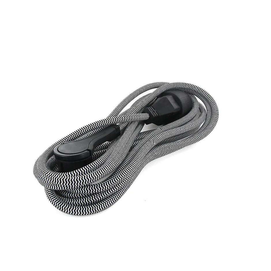Prolongateur textile Schuko. Couleur(s) : au choix. Longueur : 3m ou 5m. Utilisation : intérieure uniquement. Type de câble : H05VV-F 3×1,5 mm². Fiche : plate, avec prise à la terre. Type de prise : Schuko. Puissance maximale : 3680 W. Intensité : 16 A. Tension : 250 V