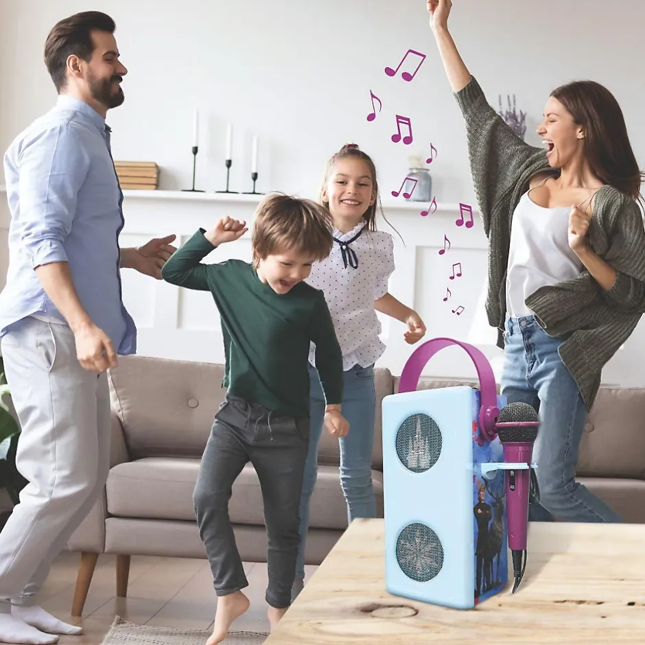 Magnifique Enceinte Bluetooth lumineuse avec micro La Reine des Neiges• 2 puissants haut-parleurs avec des effets lumineux multicolores • Fonctionne via Bluetooth mais également avec une carte SD/TF, une clé USB ou un câble Aux-in (câble inclus) • Micro inclus avec boutons de contrôle du volume et de l’écho• Batterie rechargeable via port USB type C (câble inclus)• Anse pour karaoké facile à transporter
