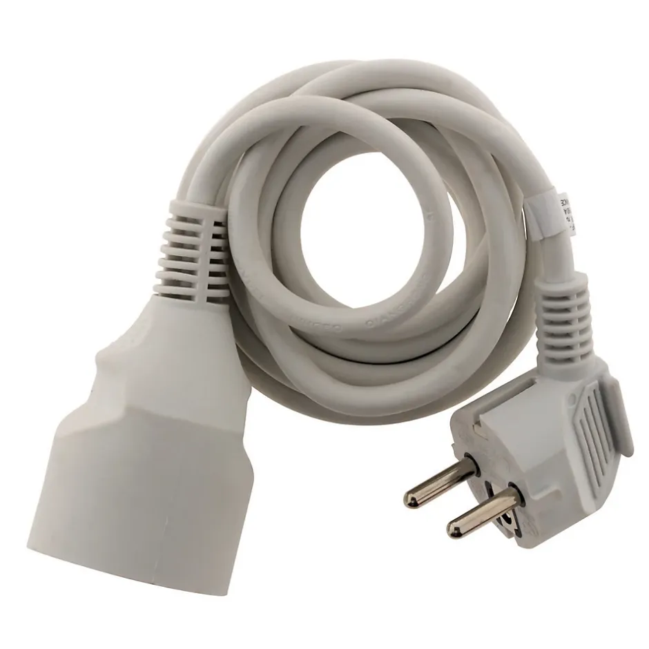 Prolongateur électrique 6A, 2 prises. Longueur du cordon au choix. Type de câble : HO3VVH2F 2×0,75 mm². Puissance maximale : 1380 W sous 230 V. Normes : conforme CE et NF. Sécurité : protection enfants intégrée. Usage : pour appareils électriques domestiques. Installation : simple à brancher et à déplacer