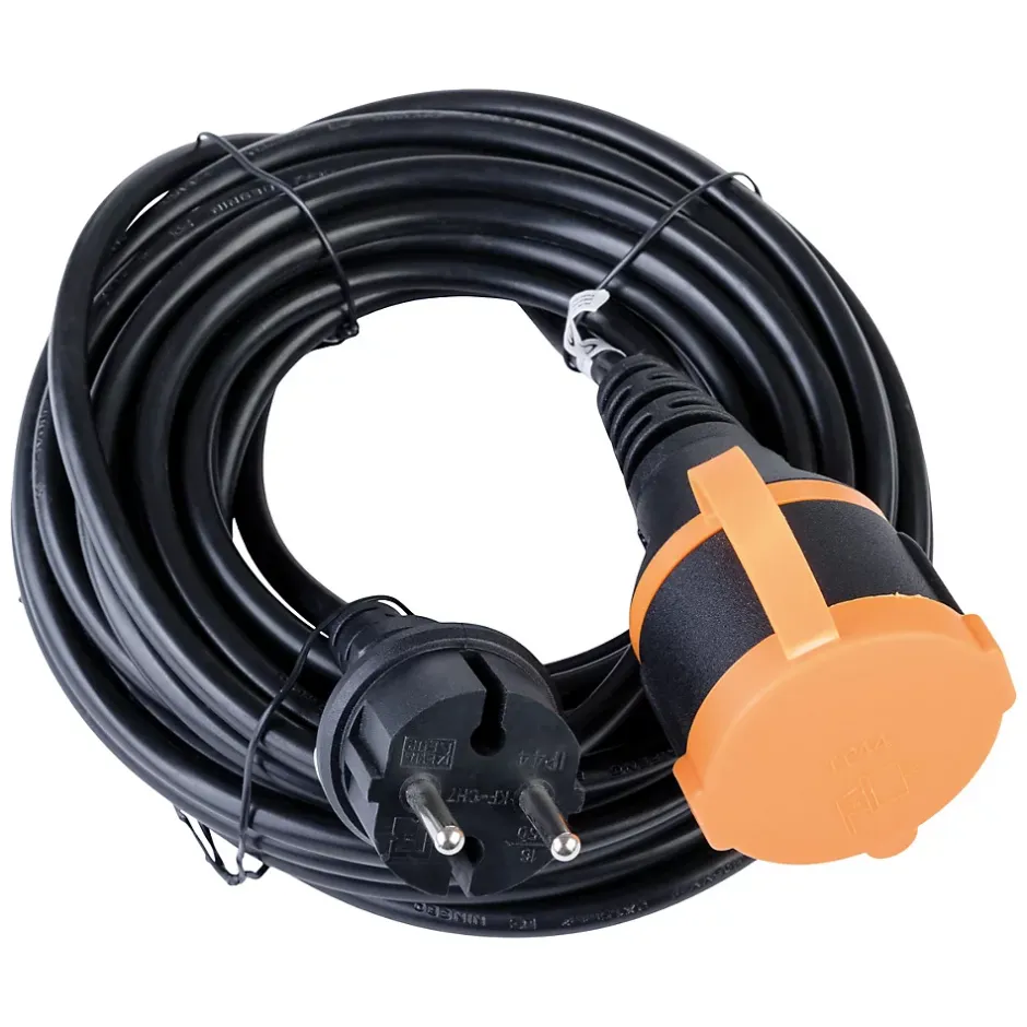 Prolongateur étanche 2P. Couleur(s) : orange. Câble : HO5VV-F 2×1,5 mm². Avec clip de fixation. Niveau de protection : IP44 (résiste aux projections d’eau). Utilisation : extérieure et domestique. Idéal pour : tondeuses, taille-haies, coupe-bordures, appareils de jardin. Norme : conforme aux standards européens de sécurité. Installation : simple et pratique grâce au clip intégré