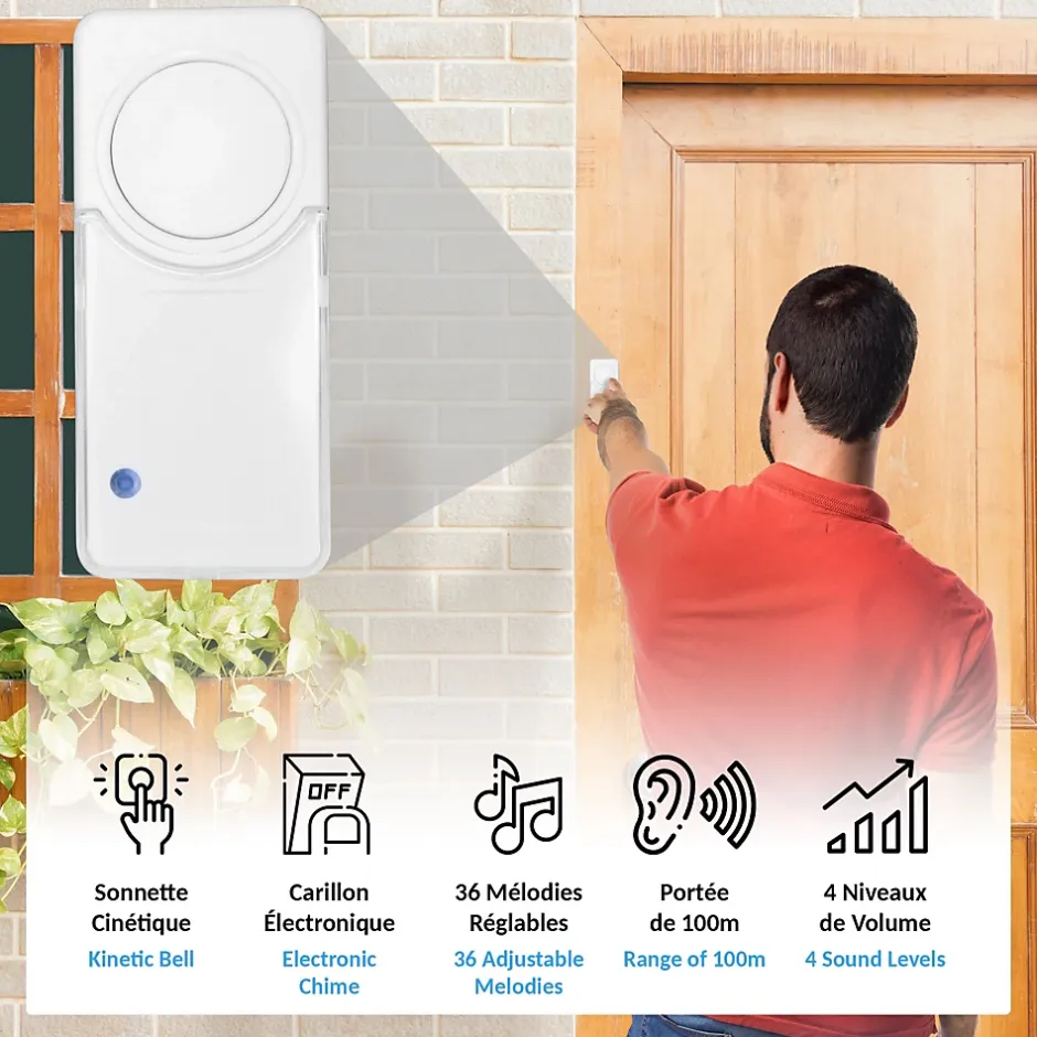 ? – ECONOMIQUE ? Avec cette sonnette, faites des économies de pile ! L’émetteur transforme l’énergie cinétique en signal radio fréquence qui est alors transmis au récepteur. Ce dernier branché sur secteur sonne lors de réception du message par l’émetteur.? – FACILE ? Le récepteur se branche simplement sur secteur dans n’importe quelle pièce de votre maison. Avec son appairage automatique, vous pouvez disposer plusieurs récepteurs dans votre maison facilement.? – LUMINEUX ? La sonnette cinétique est composée d’une lumière bleue à l’avant du récepteur, en plus de la sonnerie, la lumière s’illumine lorsque quelqu’un sonne. Idéal pour permettre aux personnes mal entendantes de savoir si quelqu’un sonne à la porte.? – SONNERIE ? Choisissez entre 36 mélodies chaleureuses différentes enregistrées dans le récepteur. Une fois la mélodie choisis, vous pouvez régler le niveau de volume composé de 4 intensités.? – CARACTÉRISTIQUES ? Matière : ABS ? Alimentation du récepteur : secteur 110-220 V / 433.92 MHz ? Puissance : Max 90 Db à 1 mètre ? Portée de 100 mètres champ libre ? IP : 44 – Certifiée CE, RoHS