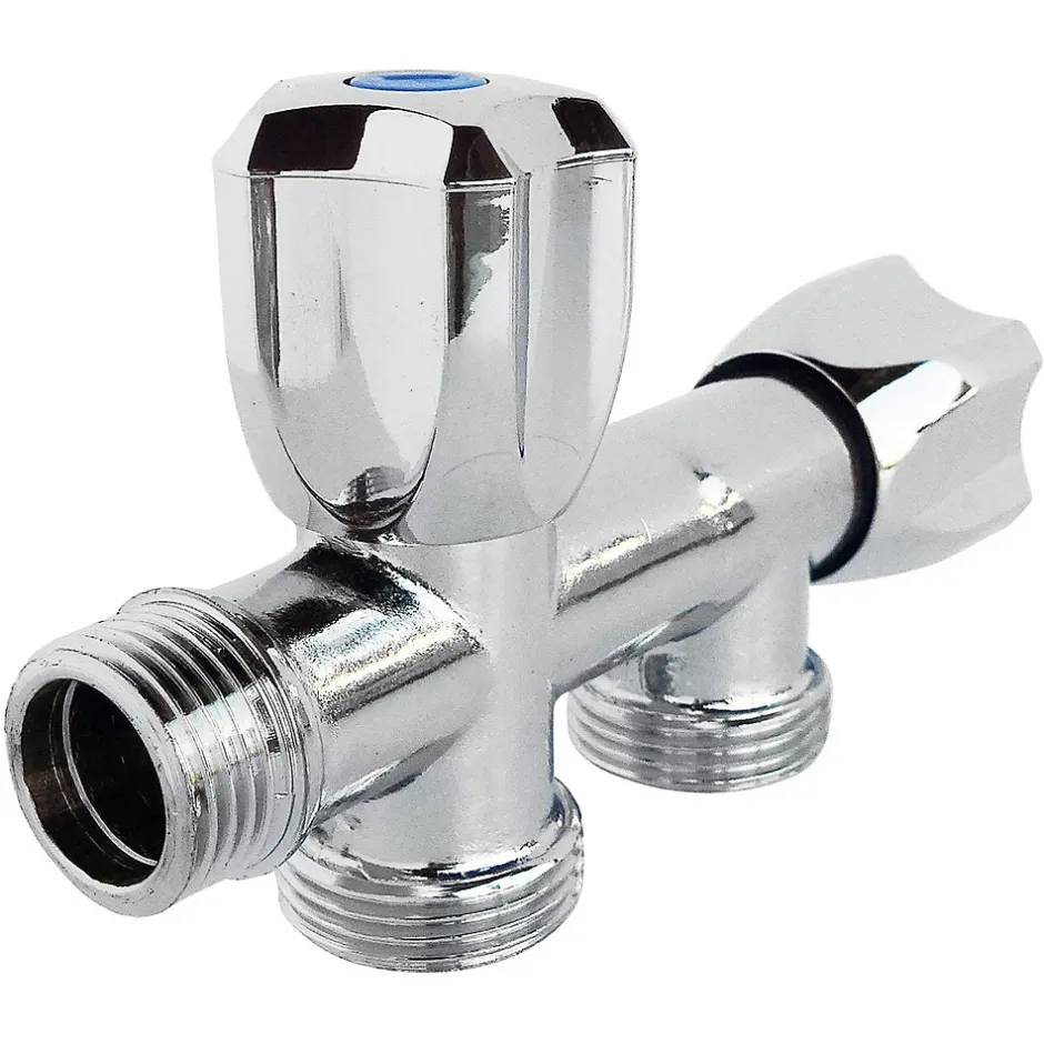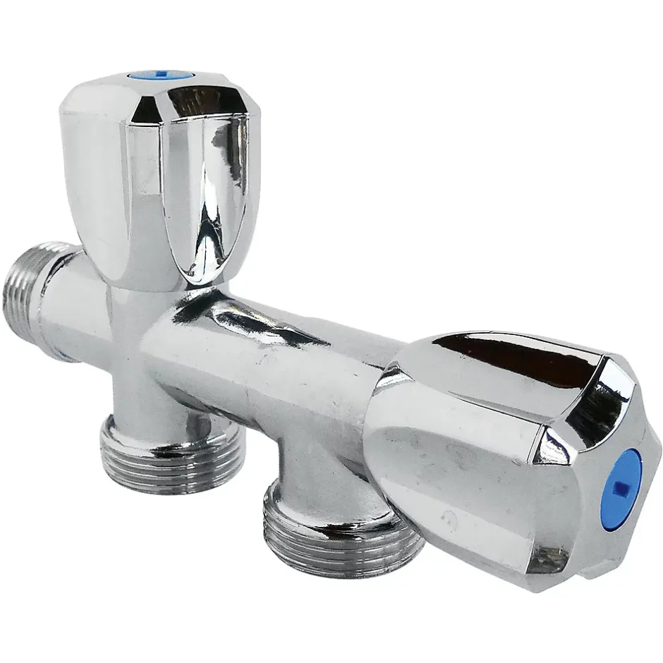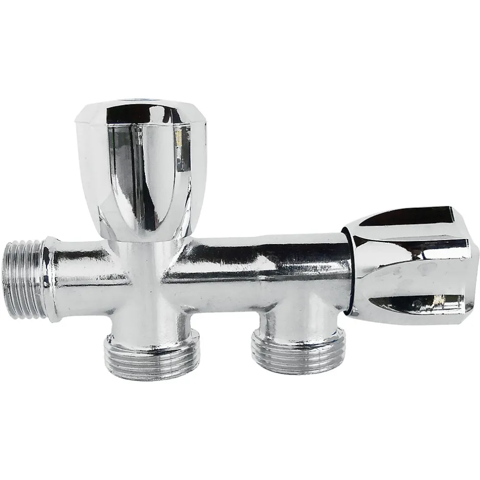 - Robinet à clapet à double sorties dans l’axe pour alimentation de deux machines à laver. Entrée Mâle 1/2″ Double sorties Mâle 3/4″ dans l’axe Corps en laiton chromé. Double croisillons en ABS chromé. Normé ACS.