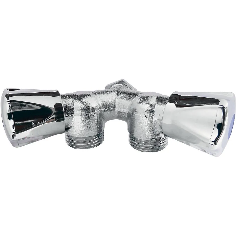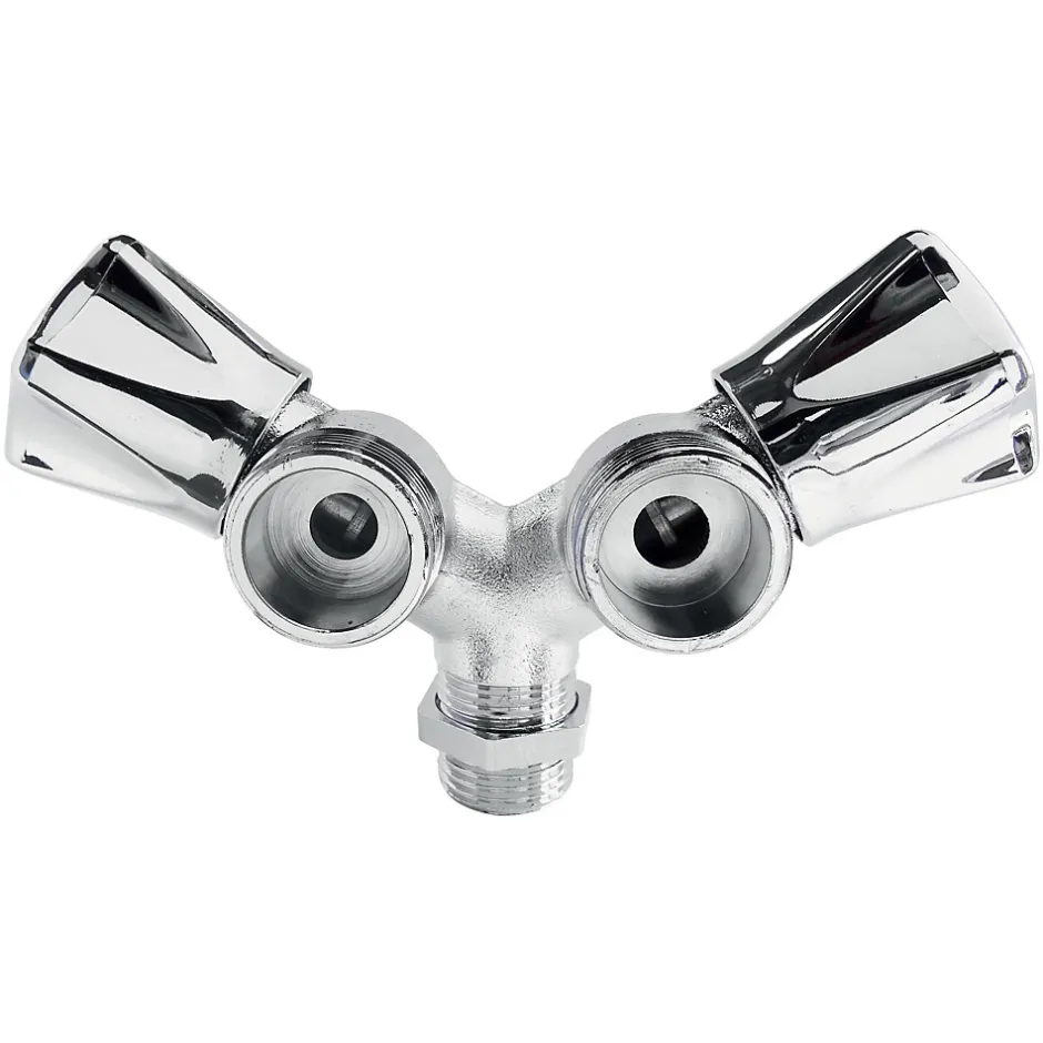 - Robinet à clapet à double sorties en Y Entrée Mâle 1/2″ Double sorties Mâle 3/4″ Corps en laiton chromé. Double croisillons en ABS chromé. Orientable par serrage à contre-écrou de blocage. Normé ACS.