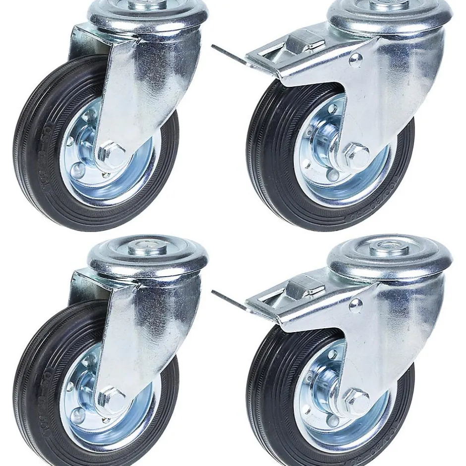 Jeu de 4 roulettes en caoutchouc noir de 100 mm avec fixation par trou de boulon unique.Ces 2 roulettes pivotantes et 2 roulettes pivotantes avec frein ont des roues en caoutchouc noir solide avec des centres en acier pressé.Le frein bloque le pivot et la roue en même temps.Les dimensions de l’article sont les suivantes :Diamètre de la roue : 100 mmLargeur de la bande de roulement : 30 mmRoulement de roue : Roulement à rouleauxTaille du trou de boulon : 10,5 mmHauteur totale : 127 mmCapacité de charge : 90kg par roulette (360kg par jeu)Dureté de la bande de roulement 85° Shore A.Résistance au roulement raisonnable, faible bruit de fonctionnement et très bonne préservation des sols.Bonne résistance chimique, sauf aux huiles.