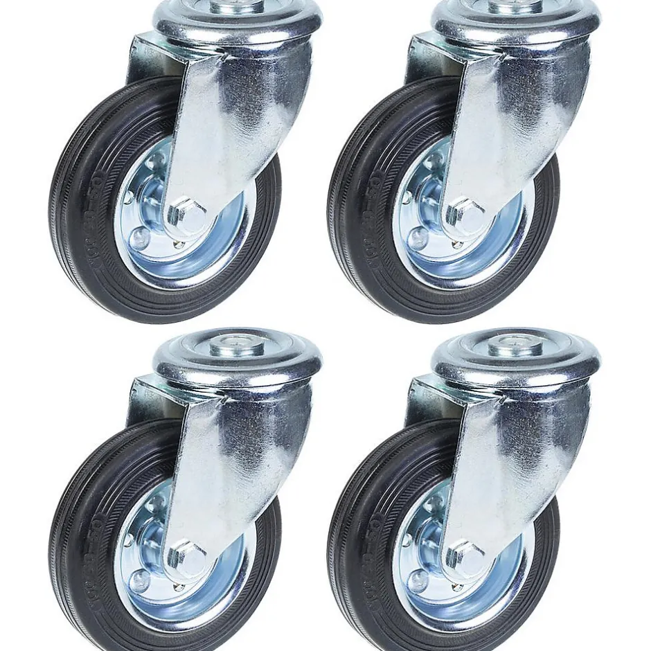 Jeu de 4 roulettes en caoutchouc noir de 100 mm avec fixation par trou de boulon unique.Ces 4 roulettes pivotantes ont des roues en caoutchouc noir avec des centres en acier pressé.Les dimensions de l’article sont les suivantes :Diamètre des roues : 100mmLargeur de la bande de roulement : 30 mmRoulement de roue : Roulement à rouleauxTaille du trou de boulon : 10,5 mmHauteur totale : 127 mmCapacité de charge : 90kg par roulette (360kg par jeu)Dureté de la bande de roulement 85° Shore A.Résistance au roulement raisonnable, faible bruit de fonctionnement et très bonne préservation des sols.Bonne résistance chimique, sauf aux huiles.
