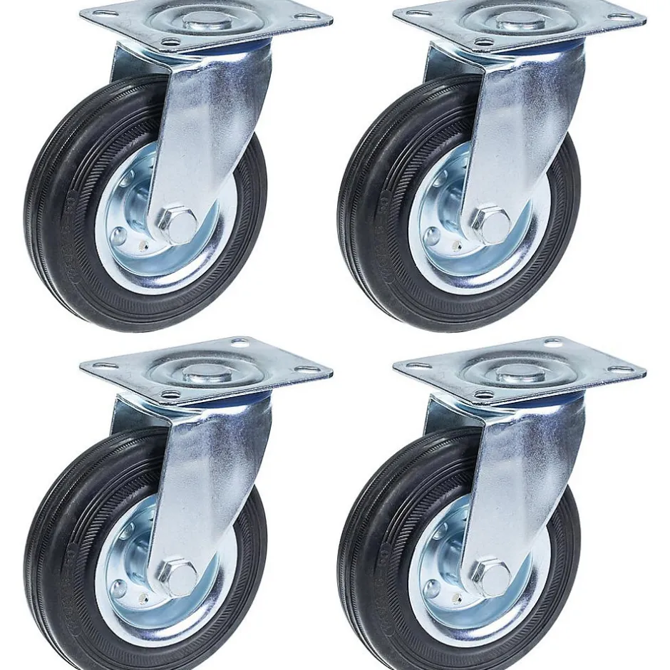 Jeu de 4 roulettes en caoutchouc noir de 125 mm avec plaque supérieure.Ces 4 roulettes pivotantes ont des roues en caoutchouc noir avec des centres de roulements à rouleaux en acier pressé.Les dimensions de l’article sont les suivantes :Diamètre des roues : 125mmLargeur de la bande de roulement : 37,5 mmRoulement de roue : Roulement à rouleauxTaille de la plaque supérieure : 100x80mmCentre des trous de montage : 80x60mmTaille des trous de montage : 9 mmHauteur totale : 152 mmCapacité de charge : 120 kg par roulette (480 kg par jeu)Dureté de la bande de roulement 85° Shore A.Résistance au roulement raisonnable, faible bruit de fonctionnement et très bonne préservation des sols.Bonne résistance chimique, sauf aux huiles.