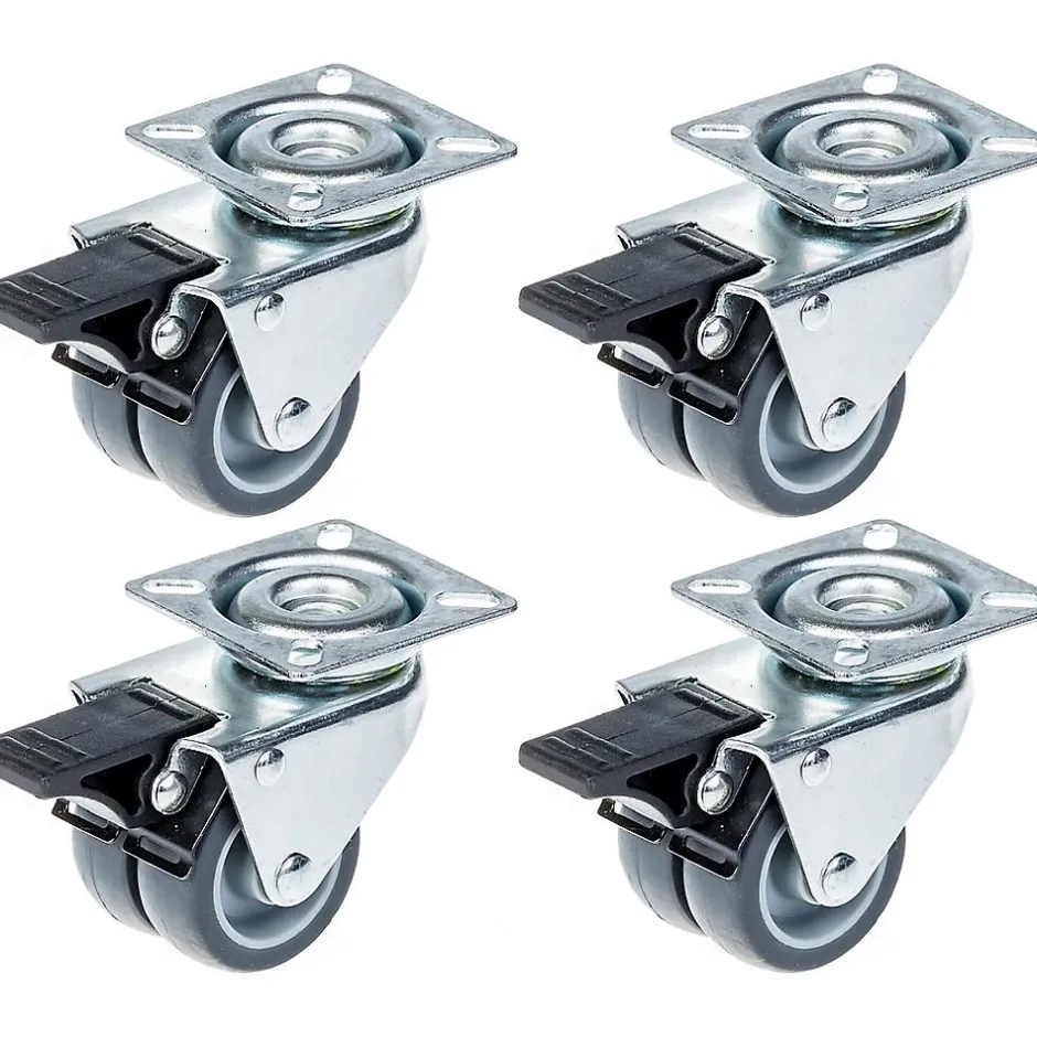 Jeu de 4 roulettes en caoutchouc gris de 50 mm avec plaque supérieure.Ces 4 roulettes doubles pivotantes avec frein ont des roues en caoutchouc thermoplastique gris solide avec des centres en plastique.Le frein bloque à la fois le pivot et les roues.Les dimensions de l’article sont les suivantes :Diamètre des roues : 2x50mmLargeur de la bande de roulement : 2x18mmRoulement de roue : Palier lisseTaille de la plaque supérieure : 60x60mmCentre des trous de montage : 43x43mmTaille des trous de montage : 6 mmHauteur totale : 71 mmCapacité de charge : 70 kg par roulette (280 kg par jeu)Dureté de la bande de roulement 85° Shore A.Résistance au roulement raisonnable, faible bruit de fonctionnement et très bonne préservation des sols. Ne marque pas.Bonne résistance chimique à de nombreuses substances.