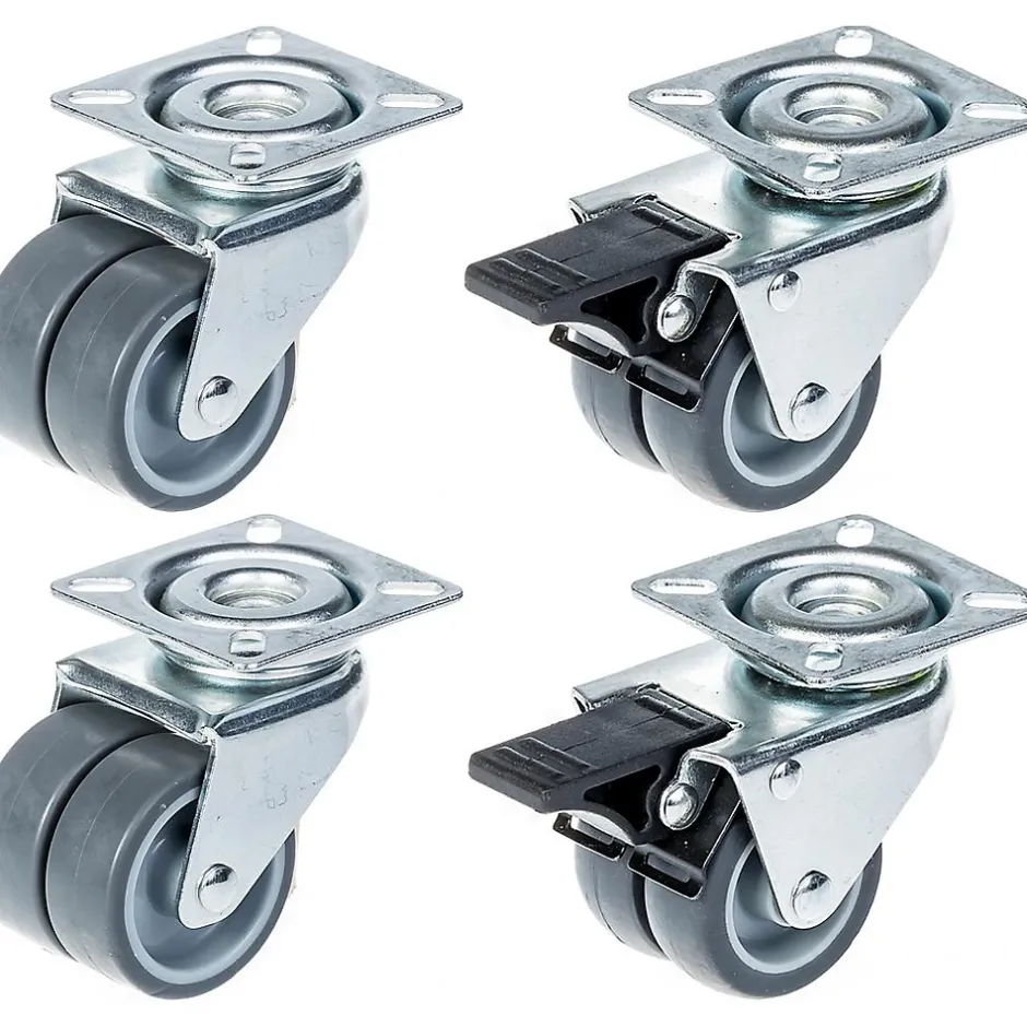 Jeu de 4 roulettes en caoutchouc gris de 50 mm avec plaque supérieure.Ces 2 roulettes pivotantes et 2 roulettes pivotantes avec frein ont des roues en caoutchouc thermoplastique gris solide avec des centres en plastique.Le frein bloque à la fois le pivotement et les roues.Les dimensions de l’article sont les suivantes :Diamètre des roues : 2x50mmLargeur de la bande de roulement : 2x18mmRoulement de roue : Palier lisseTaille de la plaque supérieure : 60x60mmCentre des trous de montage : 43x43mmTaille des trous de montage : 6 mmHauteur totale : 71 mmCapacité de charge : 70 kg par roulette (280 kg par jeu)Dureté de la bande de roulement 85° Shore A.Résistance au roulement raisonnable, faible bruit de fonctionnement et très bonne préservation des sols. Ne marque pas.Bonne résistance chimique à de nombreuses substances.