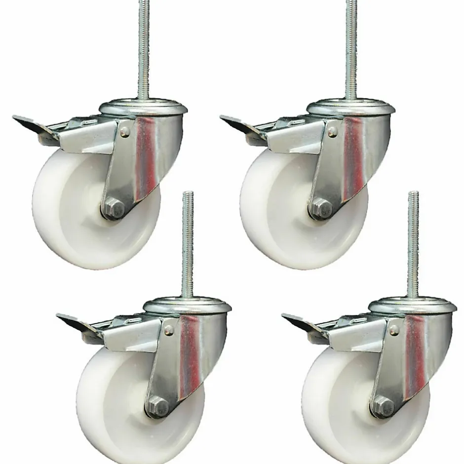 Jeu de 4 roulettes pivotantes de 100 mm 4 roulettes freinées.fixation par trou de boulon unique, fournie avec des boulons M10x60.ces roulettes ont une roue en nylon blanc de 100 mm.ces roulettes ont un frein à arrêt total qui bloque la roue et le pivotement.