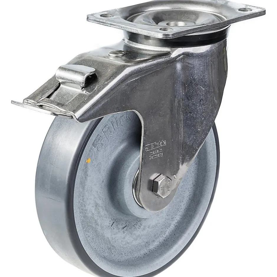Roulette pivotante/frein en acier inoxydable avec plaque supérieure robuste, support en acier embouti avec roulement à billes à double rangée dans la tête pivotante (matériau n° 1.4301/AISI 304), avec anneau de protection contre la poussière.Frein actionné au pied qui bloque simultanément le pivot et la roue.Roue en polyuréthane thermoplastique (TPU) conducteur d’électricité, collée chimiquement sur un centre en nylon. Dureté de la bande de roulement : 94° shore A. Résistance aux fuites <10â’Ω.Axe de roue boulonné.Faible résistance au roulement et bruit de fonctionnement. Bonne préservation des sols et non marquage.Très bonne résistance chimique à de nombreuses substances.