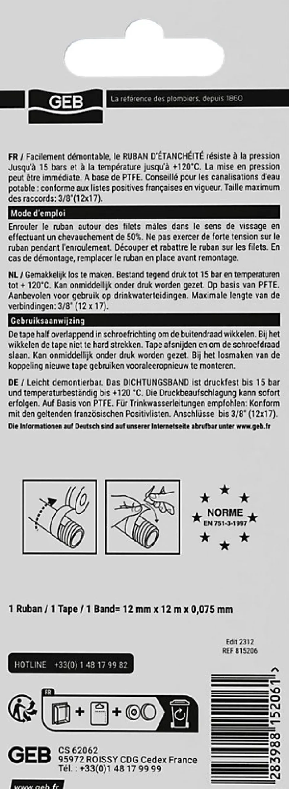 Lot de 2 rubans d’étanchéité PTFE 12mm x 12m