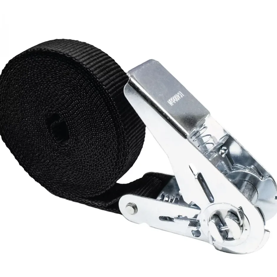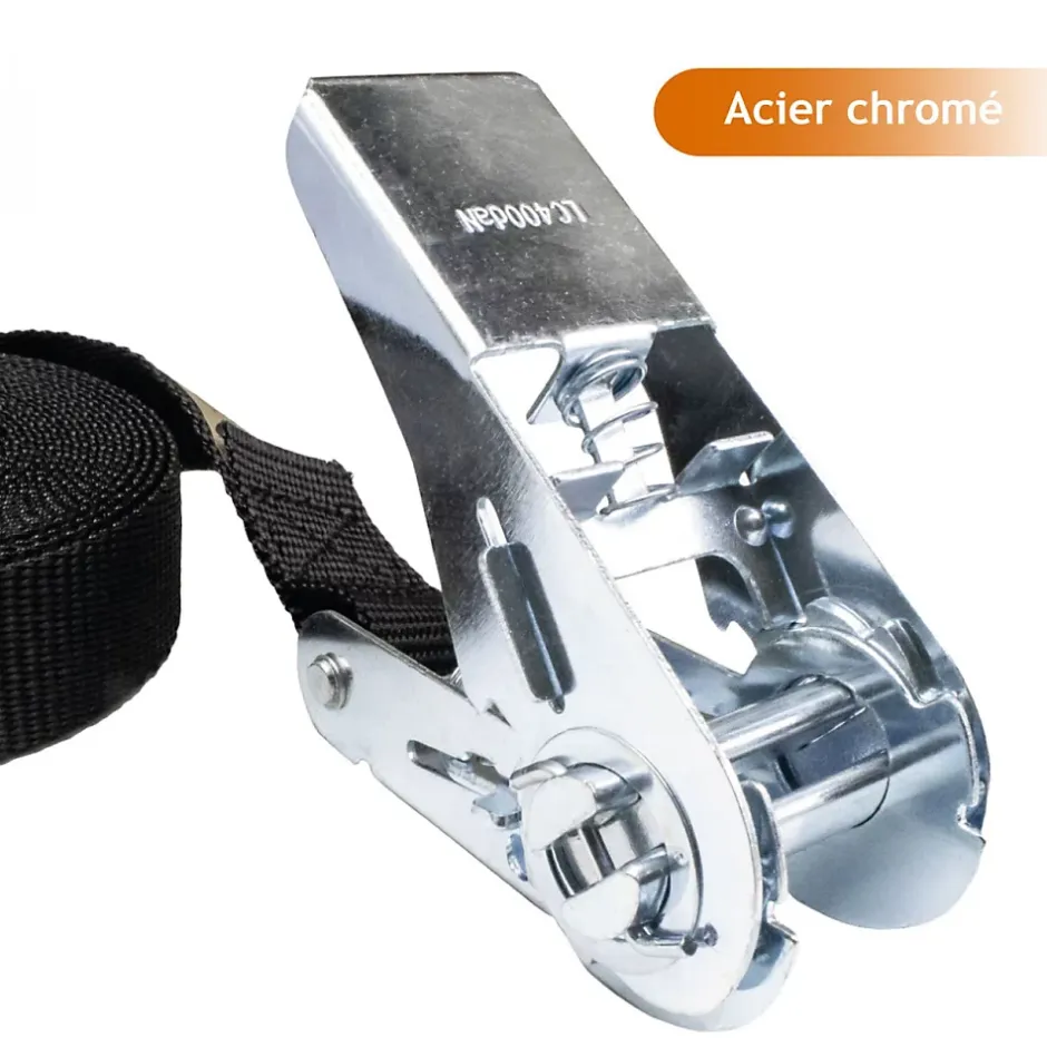 La sangle à cliquet 25 mm par 5 m Linxor est parfaite pour maintenir votre chargement et satisfaire tous vos besoins en matière d’arrimage.La sangle est réalisée en polyester et a une excellente robustesse à l’abrasion et aux U.V, associée à à un tendeur à cliquer en acier chromé, la sangle à cliquet a ainsi une haute résistance et une durabilité maximale dans le temps.La sangle à cliquet peut supporter une tension maximale d’utilisation (TMU) de 350 kg en boucle et 175 kg en bout droit.Dimensions : 5 m en longueur et 25 mm de largeur. Coloris noir.Conforme à la norme : EN 121 95-2.Autres dimensions et packs disponibles.