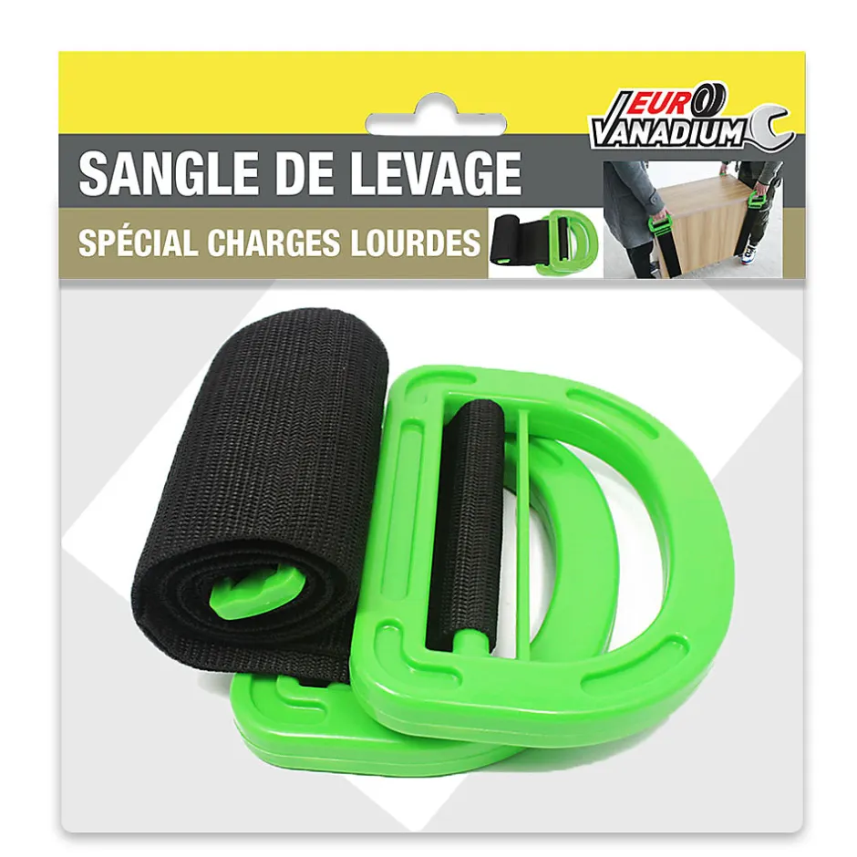 Sangle de manutention pour charge 50 kgNe forcez plus sur votre dos lors de vos manoeuvres de manutention ! La sangle de levage avec poignée vous permet de soulever tout type d’objet lourd en maintenant une posture bien droite. Lors de vos déménagements ou travaux, la sangle de manutention est votre meilleure alliée pour soulever et transporter facilement vos meubles et cartons. Ses robustes poignées et sa bande nylon hyper résistante font d’elle un outil indispensable pour remplacer un diable de manutention. Pratique, la sangle de déménagement tient bien en main et peut se régler en longueur. Sac de terreau, bûches de bois, pile de cartons. . . Plus rien ne vous fait peur ! La sangle de portage peut être utilisée seule ou à deux : en multipliant les sangles de manutention, vous pouvez augmenter le nombre de porteurs et par conséquent l’envergure de l’objet à transporter. Informations techniquesMatière : sangle en nylon et poignées en polypropylène (PP). Dimensions :Longueur totale (sangle + poignées) : 170 cm Sangle seule : longuer 145 cm x largeur 10 cm. Poignée : longueur 15 cm x largeur 11 x épaisseur 1. 6 cm. Coloris : noir et vert. Poids supporté : jusqu’à 50 kg. Sangle de manutention vendue à l’unité.