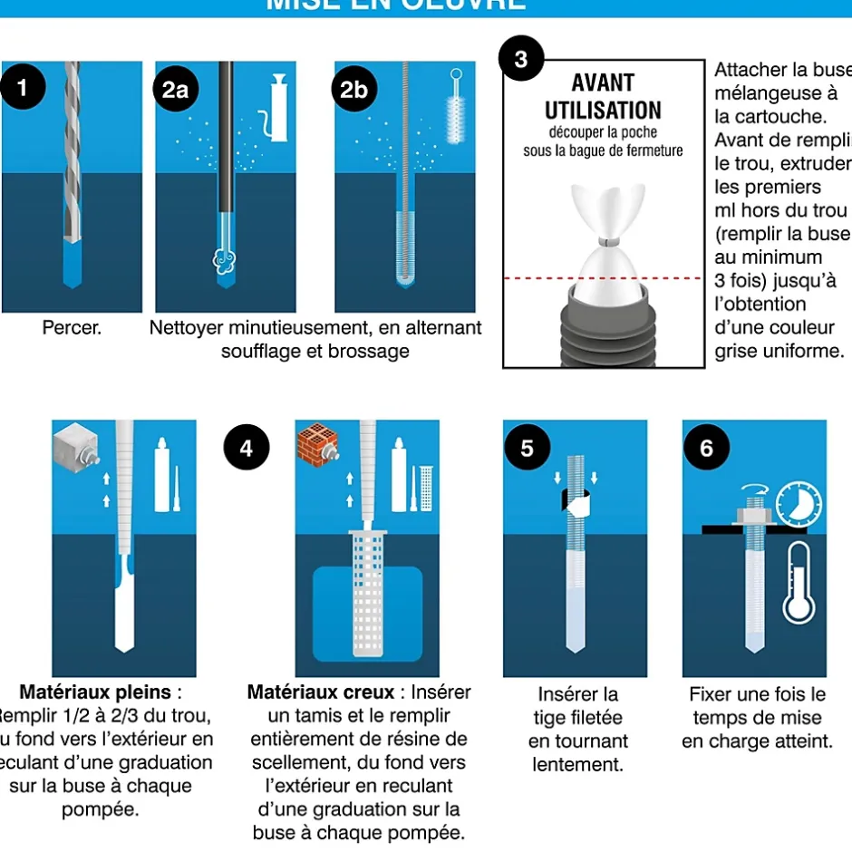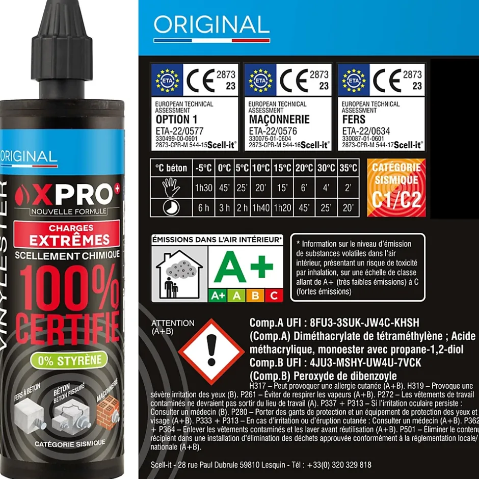 - Sécurité et performance certifiées : produit 100 % certifié 3 ETA pour béton fissuré et non fissuré, maçonneries pleines et creuses. Utilisable dans des trous humides ou immergés, avec excellente tenue mécanique.