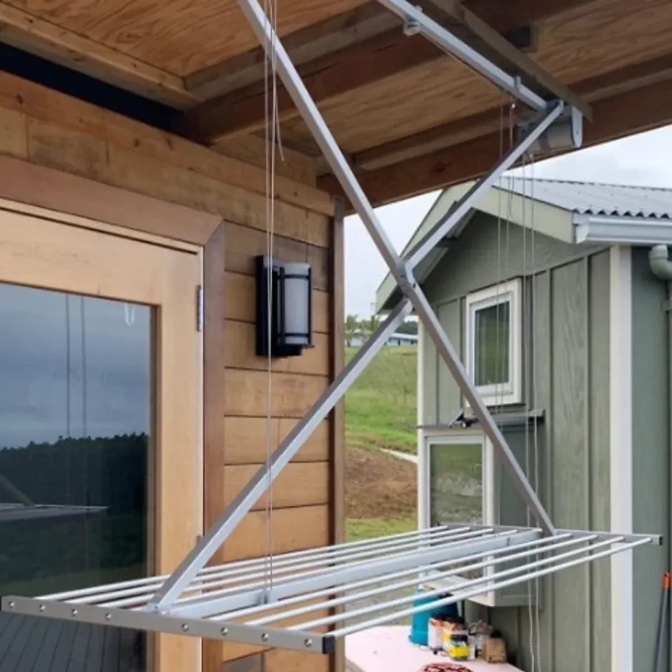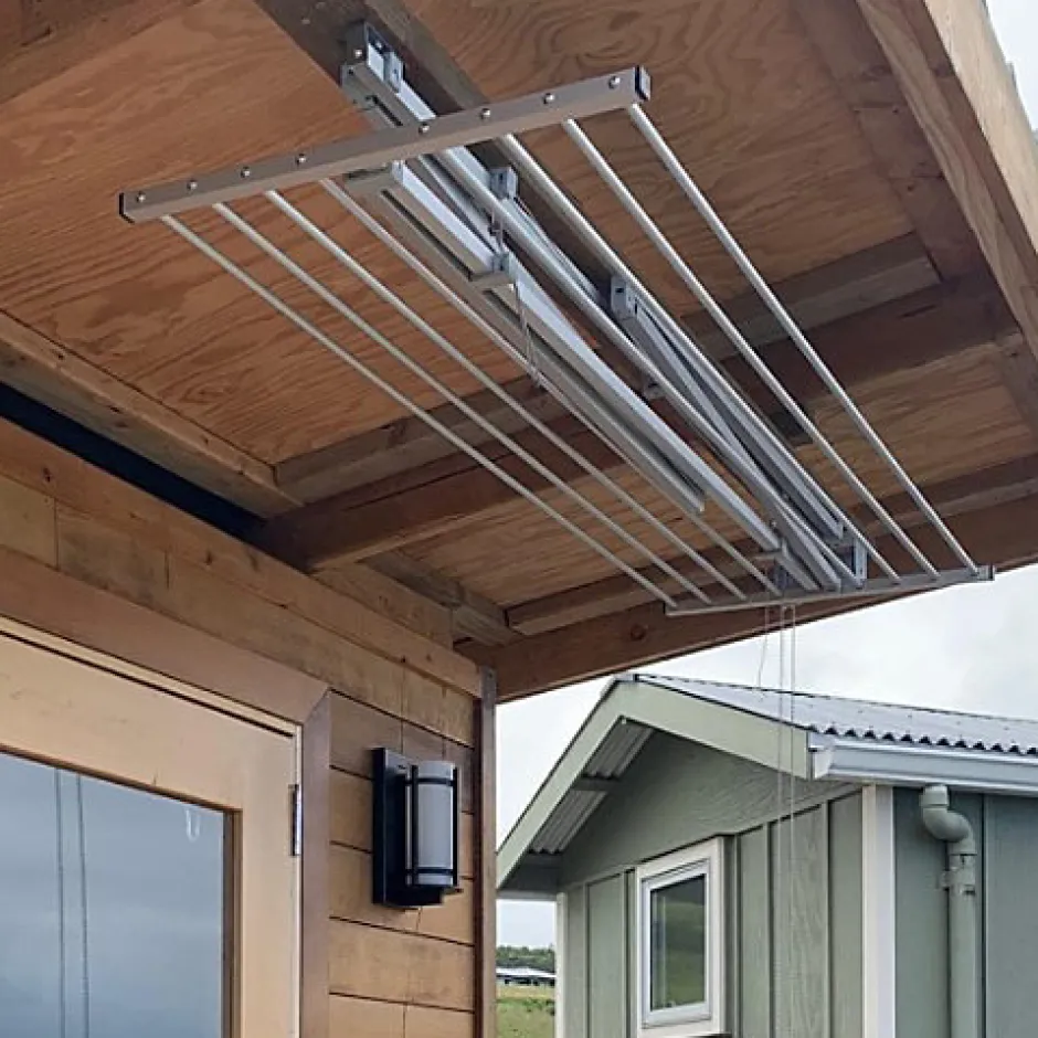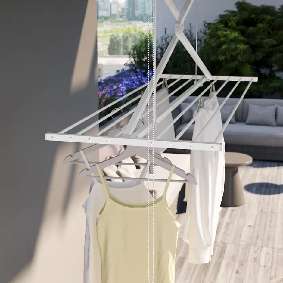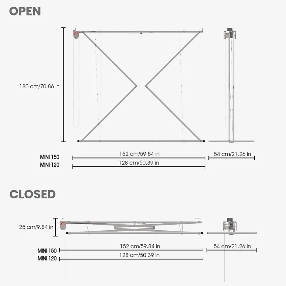 - Foxydry Mini peut être abaissé jusqu’à 1,80 mètre du plafond et bloqué à n’importe quelle hauteur, vous permettant d’étendre votre linge à une hauteur confortable et accessible.