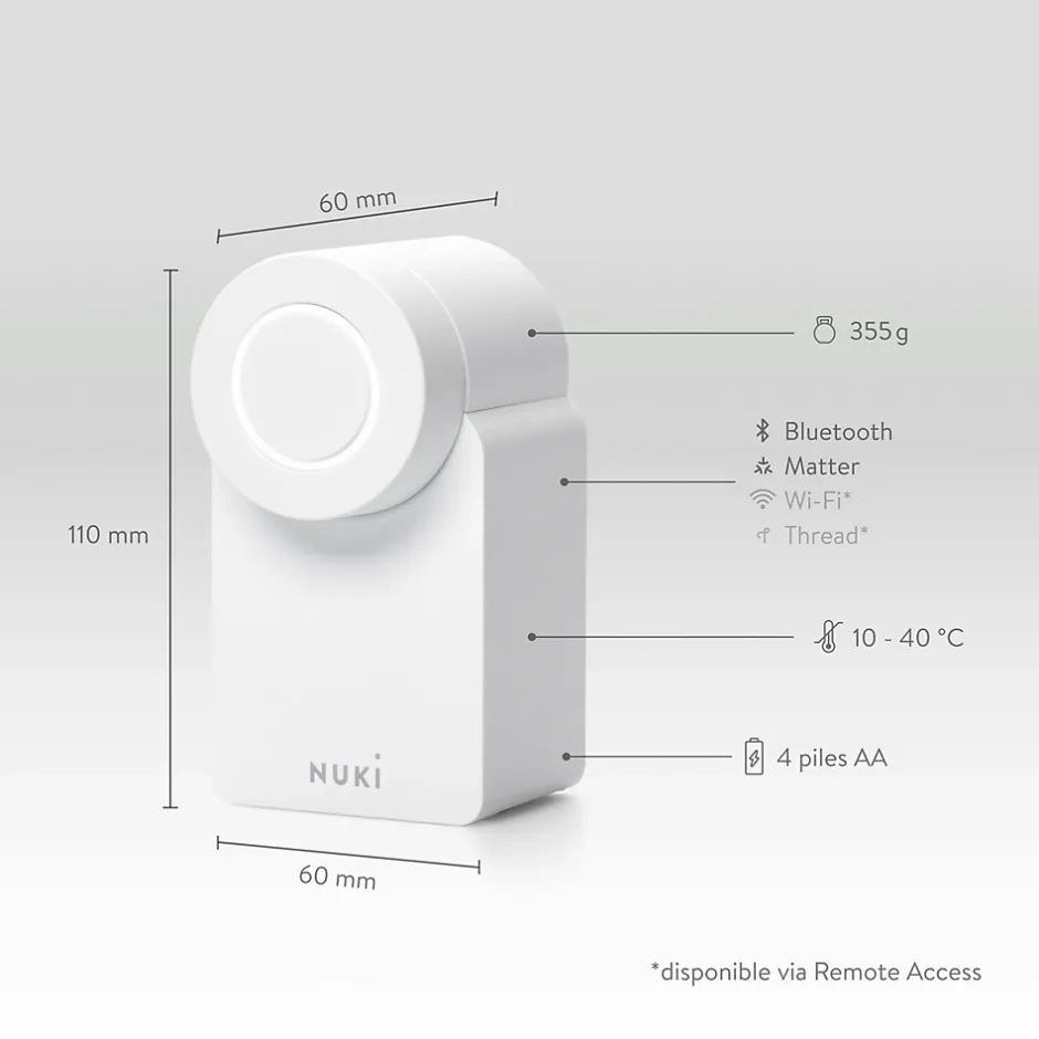 - Avec l’application Nuki, vous pouvez attribuer jusqu’à 200 autorisations d’accès, définir des horaires, activer le mode nuit, Auto Lock et Auto Unlock, et bien plus encore. Le Smart Lock Go est compatible Matter et s’intègre facilement avec tous les grands systèmes domotiques comme Apple Home, Google Home, Amazon Alexa et Homey.