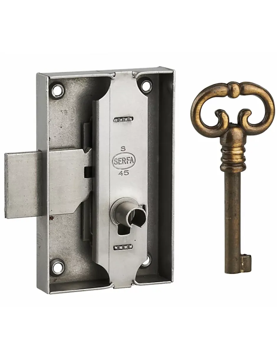 Coffre et pêne en acier. Mécanisme à 2 tours. Pose à droite. 1 clé laitonnée vieillie. Pour porte d’ameublement.