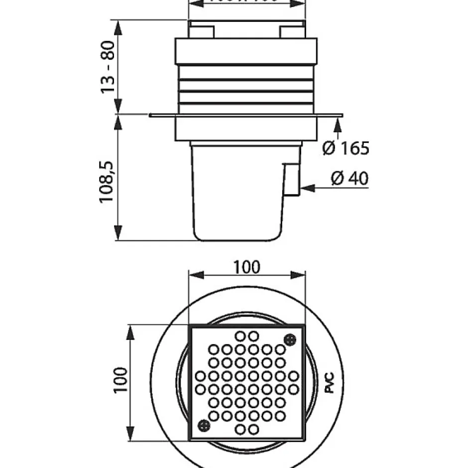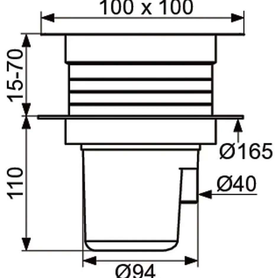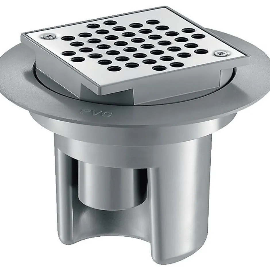 Siphon de sol avec platine à grille inox fixée par 2 vis inox, à hauteur réglable Pour garde d’eau de 50 mm et débit 36 l./mn. normalisés Sortie ø40 verticale intégrée dans la hauteur du corps PVC M Prévoir un coude PVC pour sortie horizontale