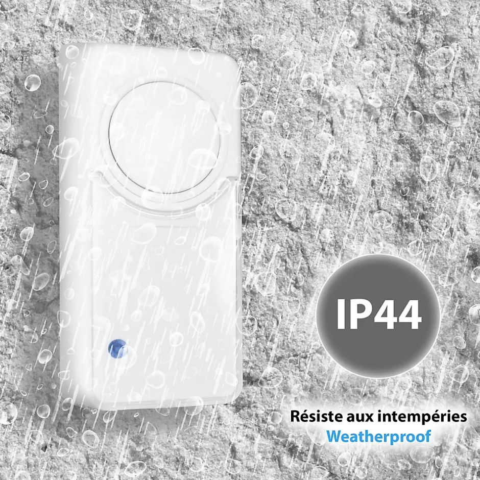 ? – ECONOMIQUE ? Avec cette sonnette, faites des économies de pile ! L’émetteur transforme l’énergie cinétique en signal radio fréquence qui est alors transmis au récepteur. Ce dernier branché sur secteur sonne lors de réception du message par l’émetteur.? – FACILE ? Simple d’utilisation, placez le récepteur ou bon vous semble, prêt de votre porte d’entrée ou de votre portail extérieur, il ne craint pas les intempéries. Le récepteur quant à lui, se branche simplement sur secteur dans n’importe quelle pièce de votre maison.? – LUMINEUX ? La sonnette cinétique est composée d’une lumière bleue à l’avant du récepteur, en plus de la sonnerie, la lumière s’illumine lorsque quelqu’un sonne. Idéal pour permettre aux personnes mal entendantes de savoir si quelqu’un sonne à la porte.? – SONNERIE ? Choisissez entre 36 mélodies chaleureuses différentes enregistrées dans le récepteur. Une fois la mélodie choisis, vous pouvez régler le niveau de volume composé de 4 intensités.? – CARACTÉRISTIQUES ? Matière : ABS ? Alimentation du récepteur : secteur 110-220 V / 433.92 MHz ? Puissance : Max 90 Db à 1 mètre ? Portée de 100 mètres champ libre ? IP : 44 – Certifiée CE, RoHS, LVD & RED